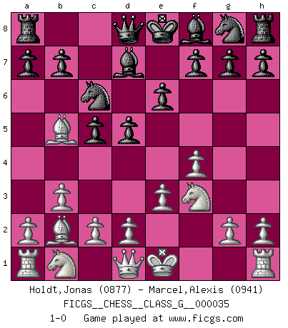 Last move : 1-0 2010 February 2 20:44:58 [Event "FICGS__CHESS__CLASS_G__000035"] [Site "FICGS"] [Date "2009.11.25"] [Round "1"] [White "Holdt,Jonas"] [Black "Marcel,Alexis"] [Result "1-0"] [WhiteElo "0877"] [BlackElo "0941"] 1.b3 d5 2.Bb2 c5 3.e3 Nc6 4.Bb5 Bd7 5.f4 e6 6.Nf3 1-0 Nimzovich-Larsen attack : Classical variation Player White won this chess game. Follow this game move after move (download)It is no time to be playing Chess when the house is on fire. (Italian Proverb) Charakterschwächen offenbaren sich normalerweise während einer Schachpartie. (Garry Kasparov) El Ajedrez es un cuento de Hadas de las 1001 metidas de pata. (Savielly Tartakower) Ce qui caractérise les parties de combat, c'est que si le défenseur a constamment de difficiles problèmes à résoudre, l'attaquant doit chercher sans relâche de nouvelles possibilités d'attaque. (Koblentz) Once you start thinking you have nothing left to learn, you have everything to learn. (Steve Badget)