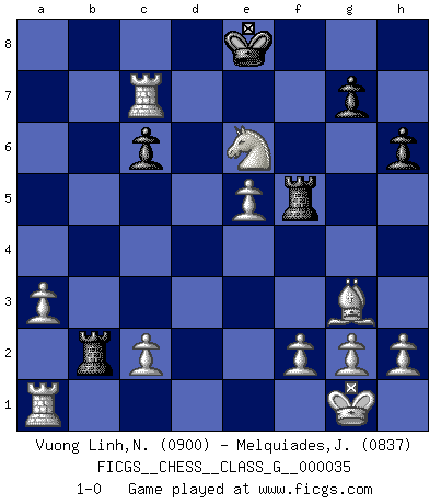 Last move : 1-0 2009 December 5 18:39:9 [Event "FICGS__CHESS__CLASS_G__000035"] [Site "FICGS"] [Date "2009.11.25"] [Round "1"] [White "Vuong Linh,Nguyen"] [Black "Melquiades,Jay"] [Result "1-0"] [WhiteElo "0900"] [BlackElo "0837"] 1.e4 e5 2.Nf3 d6 3.Bc4 Be6 4.Bxe6 fxe6 5.d4 h6 6.dxe5 Nc6 7.Bf4 d5 8.exd5 Nge7 9.dxc6 Nxc6 10.Nc3 Bb4 11.O-O Rf8 12.Bg3 Qe7 13.Qd3 Rd8 14.Qb5 Rb8 15.a3 Ba5 16.Nd4 a6 17.Nxc6 axb5 18.Nxe7 Kxe7 19.Nxb5 c6 20.Nd6 Bc7 21.Rfd1 Rbd8 22.Nxb7 Rb8 23.Nc5 Rxb2 24.Rd7+ Ke8 25.Rxc7 Rf5 26.Nxe6 1-0 Philidor's defense Kingside Castling by player White (move 11) Player White won this chess game. Follow this game move after move (download)Fischer Chess play was always razor-sharp, rational and brilliant. One of the best ever. (Dave Regis) Schach verlangt totale Konzentration. (Robert James Fischer) En un gambito tu regalas un Peón por el bién de tomar un juego perdido. (Samuel Standige Boden) La vérité est comme le meilleur coup aux échecs : elle existe, mais il faut la chercher. (Arturo Perez-Reverte) When you stop learning you start dying. (Scott Adams)