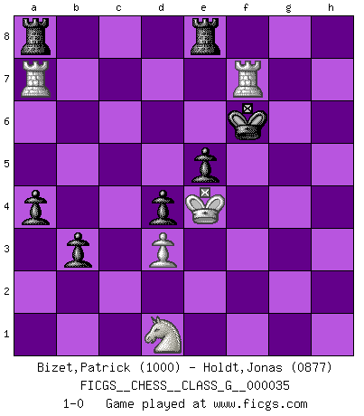 Last move : 1-0 2010 September 4 11:7:39 [Event "FICGS__CHESS__CLASS_G__000035"] [Site "FICGS"] [Date "2009.11.25"] [Round "1"] [White "Bizet,Patrick"] [Black "Holdt,Jonas"] [Result "1-0"] [WhiteElo "1000"] [BlackElo "0877"] 1.e3 Nf6 2.f4 g6 3.Nc3 Bg7 4.b3 d6 5.Bb2 O-O 6.h4 Bg4 7.Be2 Nbd7 8.Bxg4 c5 9.Bxd7 Qxd7 10.Nf3 Qg4 11.Qe2 Nh5 12.Nh2 Qxh4+ 13.Qf2 Qxf2+ 14.Kxf2 b6 15.a4 Rad8 16.g4 Nf6 17.Nf3 Nxg4+ 18.Kg3 Nh6 19.Rh2 d5 20.Rah1 Nf5+ 21.Kf2 h6 22.Nd1 d4 23.e4 Nd6 24.d3 Rfe8 25.Bc1 a6 26.Nh4 b5 27.f5 c4 28.fxg6 cxd3 29.cxd3 bxa4 30.Nf5 Nxf5 31.exf5 axb3 32.Bxh6 fxg6 33.fxg6 a5 34.Kf3 a4 35.Ke4 e5 36.Bxg7 Kxg7 37.Rh7+ Kf6 38.Ra7 Ra8 39.R1h7 Kxg6 40.Rhg7+ Kf6 41.Rgf7+ 1-0 Van't Kruijs Opening Kingside Castling by player Black (move 5) Player White won this chess game. Follow this game move after move (download)Bobby is the finest Chess player this country ever produced. His memory for the moves, his brilliance in dreaming up combinations, and his fierce determination to win are uncanny. (John Collins) Schach sollte überall auf der Welt Schulfach werden. Es fördert die geistige Auseinandersetzung. Es lehrt die Demut in der Niederlage. (Garry Kasparov) Cuando estes solo, cuando te sientas un extraño en el mundo, juega al Ajedrez. Esto levantará tu espiritu y será tu consejero de guerra. (Aristóteles) Les Echecs mettent en conflit, non pas deux intelligences, mais deux volontés. (Lasker) Vladimir Ras-Putin is still alive... He is also a good actor, I saw him in the Lord of the Rings. (Rodolfo d'Ettorre)