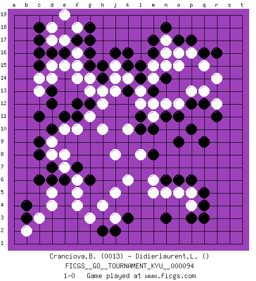 Last move : 1-0 2010 January 17 16:4:32 [Event "FICGS__GO__TOURNAMENT_KYU__000094"] [Site "FICGS"] [Date "2009.11.26"] [Round "1"] [Black "Cranciova,Bogdan"] [White "Didierlaurent,Ludovic"] [Result "1-0"] [Rating 1 "0013"] 1.q16 d15 2.q4 d4 3.c17 d17 4.c16 c14 5.d16 e17 6.e16 f16 7.f17 f18 8.g17 e15 9.e18 d18 10.c18 e19 11.g18 h10 12.c9 d9 13.c8 d8 14.c6 f14 15.c11 f4 16.k3 k6 17.d7 e7 18.e6 e8 19.g6 p4 20.q3 p5 21.q5 h4 22.n3 j5 23.p3 r14 24.q12 q13 25.p12 p13 26.q9 o15 27.o17 p16 28.p17 q15 29.r16 j8 30.f7 d5 31.d6 r12 32.r11 f5 33.d10 e10 34.e11 f10 35.k16 f6 36.p6 n5 37.o6 o5 38.o9 m14 39.n6 m5 40.b4 c3 41.b3 b2 42.h2 j3 43.j2 g3 44.f11 g11 45.g15 f15 46.g16 g14 47.h14 j15 48.k15 j14 49.h15 k14 50.j16 h13 51.l14 l13 52.l15 m15 53.m16 n16 54.m17 o12 55.p10 n17 56.n18 o16 57.m10 m11 58.n11 n12 59.o11 m6 60.m8 k10 61.k13 j13 62.m13 l12 63.n14 n15 64.d13 c13 65.d12 l8 66.g12 g13 67.f12 h12 68.c15 d14 69.l11 m12 70.l10 1-0 Here are the names of the openings (joseki) played in the four corners : Corner d16 : d15 c17 Takamoku (Gomok, Gaomu`) 5-4 Point. The takamoku (high) point (5-4). With its emphasis on influence, the 5-4 point complements the 4-4 (hoshi) point in creating an influence-oriented fuseki. San-san. Black plays the 3-3 when White has a stone at top such as marked. Corner d4 : d4 c9 Hoshi (Hwajeom, Seongjeom, Xingwei`) 4-4 Point. The star or hoshi (4-4) point, emphasizing influence at the potential expense of territory. Corner q4 : q4 p4 Hoshi (Hwajeom, Seongjeom, Xingwei`) 4-4 Point. The star or hoshi (4-4) point, emphasizing influence at the potential expense of territory. Corner q16 : q16 r14 Hoshi (Hwajeom, Seongjeom, Xingwei`) 4-4 Point. The star or hoshi (4-4) point, emphasizing influence at the potential expense of territory. Ikken Kakari (Hankan Keolch'im, Yi Gua`jiao~, 1-Space Low Approach). White 2 is the standard approach move to the 4-4. Player Black won this Go (weiqi, baduk) game. Follow this game move after move (download)While the Baroque rules of chess could only have been created by humans, the rules of go are so elegant, organic, and rigorously logical that if intelligent life forms exist elsewhere in the universe, they almost certainly play go. (Edward Lasker, international chess master) Art is the only way to run away without leaving home. (Twyla Tharp)