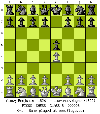 Last move : 0-1 2006 November 27 9:57:11 [Event "FICGS__CHESS__CLASS_B__000006"] [Site "FICGS"] [Date "2006.10.05"] [Round "1"] [White "Aldag,Benjamin"] [Black "Lowrance,Wayne"] [Result "0-1"] [WhiteElo "1826"] [BlackElo "1900"] 1.e4 e5 0-1 This chess game has been lost on time (started : 2006.10.05 16:17:12) King's pawn game Player Black won this chess game. Follow this game move after move (download)Nothing excites jaded Grandmasters more than a theoretical novelty. (Dominic Lawson) Schach ist das schnellste Spiel der Welt, weil man in jeder Sekunde Tausende von Gedanken ordnen muß. (Albert Einstein) Solo puedes ser bueno en el Ajedrez si amas al juego. (Bobby Fischer) Le pion, dans sa simplicité, marche droit devant lui, mais lorsqu'il prend, il le fait obliquement? Ainsi l'homme, tant qu'il reste pauvre, marche dans la droiture et vit honnêtement, mais lorsqu'il recherche les honneurs, il flatte, se parjure et, par les voies obliques, cherche une position supérieure sur l'échiquier du monde. (Jean de Galles) I find your interest interesting. (Gregory House, House M.D.)
