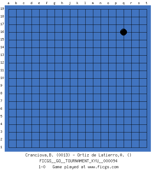 Last move : 1-0 2009 December 27 8:7:1 [Event "FICGS__GO__TOURNAMENT_KYU__000094"] [Site "FICGS"] [Date "2009.11.26"] [Round "1"] [Black "Cranciova,Bogdan"] [White "Ortiz de Latierro,Aitor"] [Result "1-0"] [Rating 1 "0013"] 1.q16 1-0 This go game has been lost on time (started : 2009.11.26 21:1:10) Here are the names of the openings (joseki) played in the four corners : Player Black won this Go (weiqi, baduk) game. Follow this game move after move (download)The strong player plays straight, the weak diagonally. (Anonymous) I feel so... helpless. (C-3PO in Star Wars ep.3)