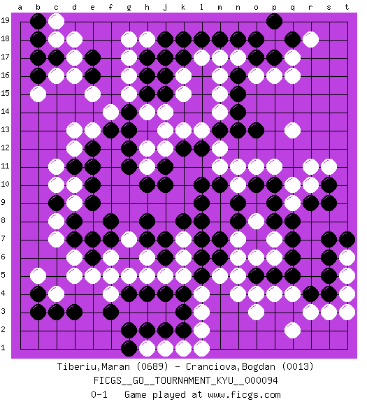 Last move : 0-1 2010 June 1 19:53:8 [Event "FICGS__GO__TOURNAMENT_KYU__000094"] [Site "FICGS"] [Date "2009.11.26"] [Round "1"] [Black "Tiberiu,Maran"] [White "Cranciova,Bogdan"] [Result "0-1"] [Rating 1 "0689"] [Rating 2 "0013"] 1.d3 q16 2.r4 d16 3.k4 d5 4.k17 o3 5.d7 q2 6.q7 r11 7.p17 q17 8.r9 d10 9.c9 f4 10.f3 l3 11.k3 c4 12.c3 f6 13.f7 h5 14.h4 g7 15.f8 c10 16.e9 d9 17.d8 d13 18.e17 d17 19.e16 o16 20.o17 p16 21.n16 q13 22.g12 c8 23.e10 c7 24.h8 s3 25.s4 r3 26.s10 s11 27.o13 n17 28.n18 m17 29.m18 m16 30.n15 m15 31.n14 m14 32.m13 k15 33.j15 k13 34.k12 j14 35.h15 k16 36.j16 l13 37.l12 h14 38.g14 j13 39.j6 h6 40.h7 m5 41.m6 n6 42.m7 o6 43.o7 q4 44.q5 p6 45.q6 l17 46.l18 j17 47.k18 g15 48.h16 g16 49.h17 g17 50.j18 f14 51.g13 e15 52.e12 d12 53.f13 m12 54.n13 m11 55.l10 o11 56.o10 p11 57.p10 n10 58.n9 j12 59.j11 h18 60.j17 g18 61.q18 p18 62.o18 r18 63.p19 d6 64.e6 e5 65.e7 h11 66.j10 h12 67.g11 l4 68.l5 k5 69.l6 j5 70.g4 g5 71.j4 l2 72.k2 k6 73.j7 p7 74.p5 n7 75.n8 k7 76.k8 m8 77.l8 m9 78.l7 n4 79.m10 n11 80.h10 q10 81.p9 o8 82.l9 e13 83.d11 c11 84.e11 f5 85.b4 b5 86.b3 p4 87.o5 n5 88.p8 t4 89.s5 t5 90.s6 k1 91.j2 j1 92.h2 q9 93.q8 r10 94.s9 t6 95.t7 t3 96.s7 h1 97.g1 l1 98.g2 o4 99.c17 c16 100.b17 c18 101.b16 b15 102.b18 c19 103.b19 d18 0-1 Here are the names of the openings (joseki) played in the four corners : Corner d4 : d3 d5 Komoku (Somok, Xiao~mu`) 3-4 Point. The komoku (3-4) point is the traditional corner enclosure move.. Ikken Takagakari (Hankan Nop'dakeolch'im, Yi Gaogua`jiao~, 1-Space High Approach). The 5-4 approach move has become more popular in modern times, as modern Go emphasizes speed and influence. Corner q4 : r4 o3 Komoku (Somok, Xiao~mu`) 3-4 Point. The komoku (3-4) point is the traditional corner enclosure move.. Niken Kakari (Dukan Keolch'im, E`r Gua`jiao~, 2-Space Low Approach). White 2 is used with friendly forces backing it up. Its purpose is to prevent a pincer. Locally it results in a loss, but may be appropriate fuseki strategy. It was popular in the late 1950s and early 1960s, but is not seen often nowadays, having been replaced by the one-space high approach, with which it has points in common. Player White won this Go (weiqi, baduk) game. Follow this game move after move (download)Take the cutting stone on the second line. (Anonymous) For to win one hundred victories in one hundred battles is not the acme of skill. To subdue the enemy without fighting is the acme of skill. (Sun Tzu)