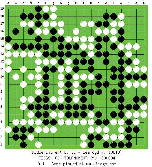 Last move : 0-1 2010 January 10 12:48:51 [Event "FICGS__GO__TOURNAMENT_KYU__000094"] [Site "FICGS"] [Date "2009.11.26"] [Round "1"] [Black "Didierlaurent,Ludovic"] [White "Learoyd,Ronald"] [Result "0-1"] [Rating 2 "0819"] 1.d16 q4 2.q15 d4 3.c14 q17 4.o17 p16 5.o15 p15 6.p14 o16 7.n15 n16 8.n17 m17 9.m16 l17 10.q16 p17 11.p18 q18 12.o18 m15 13.l16 o14 14.n14 m14 15.n13 k16 16.o13 q14 17.q13 r14 18.e5 d5 19.d6 c6 20.e7 c7 21.c10 e4 22.f6 g5 23.g6 h5 24.h6 k15 25.q11 j6 26.q5 p4 27.p5 o5 28.q7 r5 29.r6 s5 30.s6 e10 31.f11 e11 32.f14 c11 33.j5 j4 34.k5 k4 35.l5 l4 36.j7 m5 37.k6 c9 38.f10 e9 39.f9 e8 40.f8 d7 41.e6 f12 42.e12 e13 43.d12 d13 44.f4 f3 45.g4 h4 46.f5 g3 47.c12 c13 48.b12 b13 49.f13 g12 50.d11 d10 51.b11 b10 52.d14 a12 53.b14 a11 54.e14 c11 55.h14 m7 56.j13 o7 57.m6 n6 58.l6 f17 59.e17 f16 60.h15 h17 61.g16 g17 62.k14 m13 63.m12 k7 64.l7 k8 65.l8 k9 66.l9 k10 67.k11 j11 68.h12 h11 69.g11 j12 70.h13 l10 71.k12 m10 72.j10 h10 73.j9 h9 74.j8 h8 75.m8 h7 76.j6 g7 77.f7 n7 78.n8 o8 79.n9 n11 80.o9 p9 81.q9 p10 82.p8 q10 83.r10 o10 84.p11 n12 85.l12 r9 86.q8 r11 87.s10 s9 88.n10 o11 89.m11 s11 90.t10 t9 91.o12 q10 92.p10 t11 93.q10 r13 94.r12 s12 95.q12 s14 96.f18 g18 97.e18 a14 98.a15 a13 99.b16 h16 100.g15 t6 101.t7 t5 102.s7 p6 103.q6 l14 104.l13 l15 105.g13 e12 106.p7 o6 107.o4 o3 108.n4 n3 109.r4 s4 110.r3 m4 111.n5 q2 112.r2 q3 113.r1 j15 114.q1 o2 115.p1 p2 116.o1 n1 117.s3 e16 118.e15 f19 119.e19 g19 120.j14 d17 121.d18 c17 122.c18 pass 123.c3 c4 124.b2 b4 125.b3 d2 126.d3 e3 127.c2 e1 128.c1 a3 129.m2 m3 130.n2 l2 131.m1 l1 0-1 Here are the names of the openings (joseki) played in the four corners : Corner q16 : q15 q17 Takamoku (Gomok, Gaomu`) 5-4 Point. The takamoku (high) point (5-4). With its emphasis on influence, the 5-4 point complements the 4-4 (hoshi) point in creating an influence-oriented fuseki. Komoku. Black responds with 3-3, 3-5, 4-6, 4-7, 3-6, 3-7. Corner d4 : d4 e5 Hoshi (Hwajeom, Seongjeom, Xingwei`) 4-4 Point. The star or hoshi (4-4) point, emphasizing influence at the potential expense of territory. Corner q4 : q4 q5 Hoshi (Hwajeom, Seongjeom, Xingwei`) 4-4 Point. The star or hoshi (4-4) point, emphasizing influence at the potential expense of territory. Player White won this Go (weiqi, baduk) game. Follow this game move after move (download)The intersection is rarely neutral. (Pierre Audouard) Computers have lots of memory but no imagination. (Anonymous)