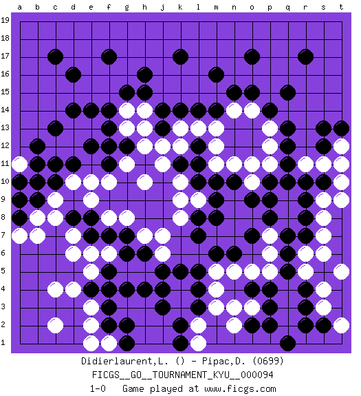 Last move : 1-0 2010 March 1 17:0:8 [Event "FICGS__GO__TOURNAMENT_KYU__000094"] [Site "FICGS"] [Date "2009.11.26"] [Round "1"] [Black "Didierlaurent,Ludovic"] [White "Pipac,Darko"] [Result "1-0"] [Rating 2 "0699"] 1.d16 c4 2.q15 q4 3.c13 d6 4.h16 k10 5.k11 h10 6.l10 j11 7.l11 k9 8.q10 j12 9.j13 k12 10.l12 k13 11.k14 l13 12.l14 m13 13.q5 p7 14.p4 p5 15.r4 q3 16.p3 q2 17.p2 r5 18.q6 p6 19.s5 r6 20.q7 s4 21.r3 s6 22.r2 t5 23.q1 q8 24.r7 s7 25.r8 s8 26.r9 q9 27.p8 p9 28.o9 o8 29.p10 o10 30.p8 n9 31.p9 n7 32.n10 o11 33.m9 n8 34.l8 l9 35.m8 m7 36.l7 m11 37.m10 n11 38.m6 n5 39.n6 o5 40.o7 m5 41.l5 m4 42.l4 m3 43.l3 l2 44.k2 l1 45.k1 n2 46.o4 o3 47.o2 k3 48.j3 k4 49.k5 m12 50.n15 s9 51.s10 t9 52.c10 d10 53.j4 j7 54.e4 g5 55.g4 e5 56.f5 f6 57.f4 d4 58.g6 h5 59.h6 j6 60.j5 h7 61.g7 g8 62.f7 e6 63.e7 d7 64.f13 f12 65.q13 p11 66.q11 p12 67.q12 p13 68.p14 o14 69.o15 n14 70.m14 h13 71.j14 g13 72.f14 g14 73.g15 e13 74.e14 d13 75.d14 c12 76.b12 c11 77.b11 c9 78.e12 d12 79.d11 e10 80.g12 h12 81.f11 g11 82.f12 f10 83.r17 b10 84.c11 f8 85.e8 e9 86.d8 c8 87.h4 e3 88.f3 e2 89.f2 f1 90.g1 e1 91.g2 c2 92.m16 t10 93.s12 s11 94.r10 t12 95.t13 t11 96.s13 s3 97.c17 n3 98.k17 h14 99.h15 k8 100.f17 a11 101.b9 a9 102.a10 b8 103.a8 a7 104.b10 a9 105.s2 t2 106.a8 b7 107.a9 r11 108.o17 1-0 Here are the names of the openings (joseki) played in the four corners : Corner q4 : q4 q5 Hoshi (Hwajeom, Seongjeom, Xingwei`) 4-4 Point. The star or hoshi (4-4) point, emphasizing influence at the potential expense of territory. Player Black won this Go (weiqi, baduk) game. Follow this game move after move (download)Don't try to enclose an open skirt. (Anonymous) Life is like a ten-speed bicycle: most of us have gears we never use. (Charles M. Schulz)