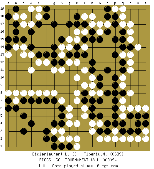 Last move : 1-0 2010 May 2 15:23:3 [Event "FICGS__GO__TOURNAMENT_KYU__000094"] [Site "FICGS"] [Date "2009.11.26"] [Round "1"] [Black "Didierlaurent,Ludovic"] [White "Tiberiu,Maran"] [Result "1-0"] [Rating 2 "0689"] 1.d16 r4 2.d4 q17 3.g17 k4 4.g13 k16 5.p10 q10 6.g4 h3 7.p13 q13 8.d7 o10 9.p9 q9 10.q8 r8 11.k17 l16 12.l17 m17 13.j17 q7 14.p8 d11 15.h4 g3 16.f3 c14 17.c15 c8 18.d14 c13 19.q12 r12 20.q11 r11 21.q14 r13 22.p4 p3 23.o3 m3 24.q3 p2 25.q4 q2 26.r3 o2 27.n3 n2 28.r5 r6 29.p7 q6 30.p6 q5 31.s4 s6 32.p5 g11 33.p15 r15 34.r14 s14 35.o16 o17 36.m16 n16 37.m15 l14 38.n15 n17 39.l15 k15 40.k14 j14 41.k13 j15 42.j13 h14 43.g14 h13 44.h12 o9 45.l13 r2 46.c7 b7 47.b6 b8 48.m11 m10 49.g7 f8 50.f7 d8 51.o11 k10 52.o8 n8 53.n7 m8 54.m7 k7 55.l8 m9 56.n10 l9 57.n9 k8 58.l7 l6 59.m6 l5 60.m5 m4 61.o4 h11 62.g12 f12 63.f13 e12 64.g2 h2 65.f2 h7 66.c5 g8 67.h6 j6 68.h5 j4 69.q16 r16 70.p17 q18 71.p18 l18 72.k18 m18 73.o18 l11 74.m12 k12 75.b15 b14 76.c3 j12 77.h15 c17 78.b17 b18 79.b16 d17 80.a18 c18 81.e17 e18 82.f18 d19 83.f19 e19 84.b19 p19 85.o19 q19 86.q15 r17 87.e7 e8 88.h1 j2 89.j1 k1 90.g1 k2 91.a14 a13 92.a15 d13 93.e13 s2 94.s3 n4 95.n5 j5 96.s5 t6 97.t5 t3 98.t4 t2 99.a7 a8 100.a6 pass 101.pass 1-0 Here are the names of the openings (joseki) played in the four corners : Corner q16 : q17 p13 Komoku (Somok, Xiao~mu`) 3-4 Point. The komoku (3-4) point is the traditional corner enclosure move.. Corner q4 : r4 p9 Komoku (Somok, Xiao~mu`) 3-4 Point. The komoku (3-4) point is the traditional corner enclosure move.. Player Black won this Go (weiqi, baduk) game. Follow this game move after move (download)When your opponent is thick, you must also become thick. (Otake Hideo, 9p) A good player is always lucky. (Capablanca)