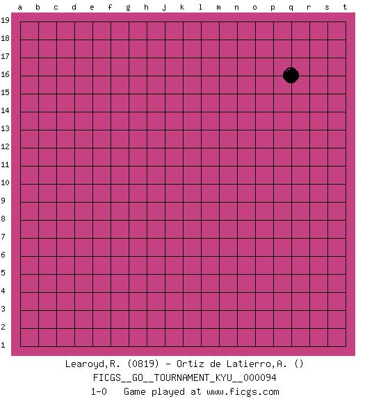 Last move : 1-0 2009 December 27 20:7:7 [Event "FICGS__GO__TOURNAMENT_KYU__000094"] [Site "FICGS"] [Date "2009.11.26"] [Round "1"] [Black "Learoyd,Ronald"] [White "Ortiz de Latierro,Aitor"] [Result "1-0"] [Rating 1 "0819"] 1.q16 1-0 This go game has been lost on time (started : 2009.11.26 21:1:10) Here are the names of the openings (joseki) played in the four corners : Player Black won this Go (weiqi, baduk) game. Follow this game move after move (download)Five liberties for tactical stability. (Anonymous) May the force be with you. (Han Solo in Star Wars ep.4)