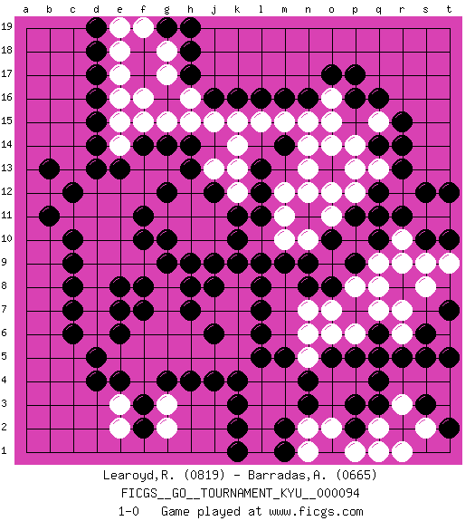 Last move : 1-0 2009 December 12 1:43:3 [Event "FICGS__GO__TOURNAMENT_KYU__000094"] [Site "FICGS"] [Date "2009.11.26"] [Round "1"] [Black "Learoyd,Ronald"] [White "Barradas,Anderson"] [Result "1-0"] [Rating 1 "0819"] [Rating 2 "0665"] 1.q16 o15 2.d4 f5 3.d16 f16 4.q4 e11 5.j16 j15 6.k16 k15 7.l16 l15 8.m16 m15 9.n16 n15 10.p17 o16 11.o17 h16 12.h17 g17 13.h18 g18 14.g19 f19 15.h19 e18 16.d13 e14 17.d14 e15 18.d15 e16 19.d17 e17 20.d18 e19 21.e13 f13 22.r14 p14 23.q12 p12 24.q11 p13 25.p11 o11 26.o10 n10 27.n11 o12 28.n9 m10 29.m9 m11 30.l9 n12 31.k4 k5 32.j4 j5 33.h4 h5 34.g4 g5 35.e4 f4 36.f3 e5 37.d5 d6 38.c6 d7 39.c7 d8 40.c8 d9 41.c9 d10 42.c10 c11 43.c12 d12 44.b11 d11 45.b13 e12 46.j9 j10 47.k10 j11 48.h9 h10 49.g9 f9 50.k11 k12 51.g10 g11 52.j12 h11 53.l12 k13 54.l11 m12 55.l13 k14 56.l5 k6 57.l6 k7 58.l7 k8 59.k9 n13 60.f10 e10 61.f11 f12 62.g12 h12 63.h13 g13 64.h14 h15 65.g14 g15 66.f14 j13 67.f8 e9 68.l8 j7 69.e6 h6 70.e7 g7 71.f7 g8 72.h8 g6 73.d19 q13 74.r13 q15 75.r15 o14 76.m14 n14 77.p16 f15 78.q14 f6 79.e8 e3 80.h7 g3 81.f2 g2 82.j8 p8 83.p9 q9 84.q10 q8 85.o8 r10 86.r11 s11 87.s10 r9 88.s12 t11 89.t12 s9 90.t10 o7 91.q6 r7 92.p7 r6 93.r5 p6 94.p5 q7 95.q5 o6 96.o5 n5 97.n4 n6 98.s5 s8 99.t7 t6 100.s6 n7 101.n8 m4 102.m5 m3 103.n3 l4 104.m2 l3 105.k3 l2 106.k2 l1 107.k1 n2 108.m1 o2 109.q3 q2 110.s3 s2 111.t2 r1 112.o1 n1 113.p2 p1 114.p3 q1 115.pass r3 116.t5 e2 117.j6 t9 118.pass 1-0 Here are the names of the openings (joseki) played in the four corners : Corner q16 : q16 o15 Hoshi (Hwajeom, Seongjeom, Xingwei`) 4-4 Point. The star or hoshi (4-4) point, emphasizing influence at the potential expense of territory. Corner d4 : d4 f5 Hoshi (Hwajeom, Seongjeom, Xingwei`) 4-4 Point. The star or hoshi (4-4) point, emphasizing influence at the potential expense of territory. Corner d16 : d16 f16 Hoshi (Hwajeom, Seongjeom, Xingwei`) 4-4 Point. The star or hoshi (4-4) point, emphasizing influence at the potential expense of territory. Ikken Takagakari (Hankan Nop'dakeolch'im, Yi Gaojia, 1-Space High Approach). Black typically responds at 6-4 or 3-10. Black 4-10 is played when Black finds play on the right side advantageous. Black 4-8 or 3-8 may be played when Black has support at top. Player Black won this Go (weiqi, baduk) game. Follow this game move after move (download)One point in the center is worth ten in the corner. (Anonymous) Is not life a hundred times too short to bore ourselves ? (Friedrich Nietzsche)