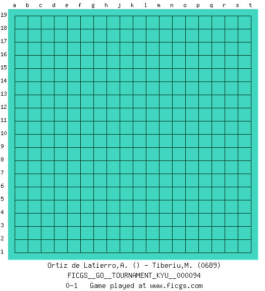 Last move : 0-1 2009 December 27 8:7:1 [Event "FICGS__GO__TOURNAMENT_KYU__000094"] [Site "FICGS"] [Date "2009.11.26"] [Round "1"] [Black "Ortiz de Latierro,Aitor"] [White "Tiberiu,Maran"] [Result "0-1"] [Rating 2 "0689"] 0-1 This go game has been lost on time (started : 2009.11.26 21:1:10) Here are the names of the openings (joseki) played in the four corners : Player White won this Go (weiqi, baduk) game. Follow this game move after move (download)Beware of the clumsy double contact. (Anonymous) Optimism is a variety of information deficit. Sometimes especially true for correspondence chess games. (Michael Aigner)
