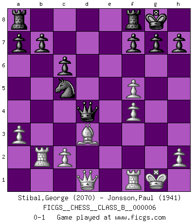 Last move : 0-1 2006 November 28 0:11:42 [Event "FICGS__CHESS__CLASS_B__000006"] [Site "FICGS"] [Date "2006.10.05"] [Round "1"] [White "Stibal,George"] [Black "Jonsson,Paul"] [Result "0-1"] [WhiteElo "2070"] [BlackElo "1941"] 1.e4 d6 2.d4 Nf6 3.Nc3 e5 4.Nf3 exd4 5.Nxd4 Be7 6.Bd3 O-O 7.O-O Nbd7 8.f4 Nc5 9.Nf5 Bxf5 10.exf5 d5 11.a3 c6 12.g4 d4 13.g5 dxc3 14.gxf6 Bxf6 15.Rb1 cxb2 16.Bxb2 Bxb2 17.Rxb2 Qd4+ 0-1 Pirc defense Kingside Castling by player Black (move 6) Kingside Castling by player White (move 7) Player Black won this chess game. Follow this game move after move (download)Chess is above all, a fight ! (Emanuel Lasker) Man kann eine Schachpartie nur gewinnen, wenn das Gleichgewicht gestört ist. In einer Stellung mit ungestörtem Gleichgewicht ist auch das größte Genie hilflos - in der Stellung steckt dann eben kein genialer Einfall. (Wilhelm Steinitz) El Ajedrez hace al hombre ser mas sabio y ver mas claro. (Vladimir Putin) Même un GMI sait rarement calculer sur plus de cinq coups une attaque à sacrifices. (Rudolf Spielmann) Logic : The art of thinking and reasoning in strict accordance with the limitations and incapacities of the human misunderstanding. (Ambrose Bierce)