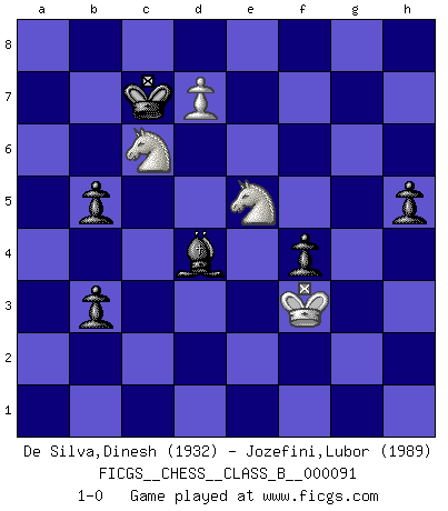 Last move : 1-0 2011 July 28 8:19:4 [Event "FICGS__CHESS__CLASS_B__000091"] [Site "FICGS"] [Date "2009.11.27"] [Round "1"] [White "De Silva,Dinesh"] [Black "Jozefini,Lubor"] [Result "1-0"] [WhiteElo "1932"] [BlackElo "1989"] 1.e4 e5 2.Nf3 Nc6 3.Bc4 Nf6 4.Ng5 d5 5.exd5 b5 6.Bf1 Nd4 7.c3 Nxd5 8.Ne4 Qh4 9.Ng3 Bg4 10.f3 Nxf3+ 11.gxf3 Bd7 12.d4 exd4 13.Qxd4 Qxd4 14.cxd4 Nb4 15.Na3 a6 16.Bd2 O-O-O 17.Kf2 Kb7 18.Bxb4 Bxb4 19.Nc2 Be7 20.b4 f5 21.Bd3 Bh4 22.Kg2 Rhf8 23.Ne2 Rf6 24.Rhf1 Re8 25.Nc1 Rc6 26.Rb1 Rc3 27.Rb3 Rc6 28.Rb2 Rc3 29.Nb3 Ka7 30.Nc5 g6 31.Nxd7 Rxd3 32.Kh3 g5 33.Ne5 Rd2 34.f4 Re2 35.fxg5 Bxg5 36.Re1 Rd2 37.Rg1 Bf4 38.Rg2 Re6 39.Rxd2 Rh6+ 40.Kg2 Rxh2+ 41.Kf3 Bxd2 42.Na1 Rh3+ 43.Kg2 Bc3 44.Kxh3 Bxb2 45.Nb3 Bc3 46.Nc6+ Kb6 47.d5 h5 48.Nc5 a5 49.a3 axb4 50.axb4 Bd2 51.Nd3 Bg5 52.Kg3 Be3 53.Kh4 f4 54.Nde5 Bd2 55.Nd3 Be3 56.Kh3 Kb7 57.Ne7 Kb6 58.Kg2 c5 59.d6 cxb4 60.Kf3 b3 61.d7 Kc7 62.Ne5 Bd4 63.N7c6 1-0 Two knights defense : Ulvestad variation Queenside Castling by player Black (move 16) 10 pieces endgame at move 59 : White KNNP , Black KBPPPP WHITE : King + 2 Knights 1 Pawn BLACK : King + 1 Bishop 4 Pawns Player White won this chess game. Follow this game move after move (download)If cunning alone were needed to excel, women would be the best Chess players. (Albin) Am wohlsten fühle ich mich, wenn ich sehe, wie sich mein Gegner im Todeskampf windet. (Robert James Fischer) Jugadores de primera clase pierden en contra de jugadores de segunda clase porque los jugadores de segunda clase a veces juegan una partida de primer clase. (Siegbert Tarrasch) Les réformistes prétendent que les progrès de la théorie conduiront à la disparition des échecs, et qu'il faut, pour leur rendre vie, en remanier les règles. En réalité, qu'exprime cette affirmation? Le mépris de l'intuition, de l'imagination et de tous les autres éléments qui font des échecs un art. (Alexander Alekhine) This is where the fun begins. (Anakin Skywalker in Star Wars ep.3)