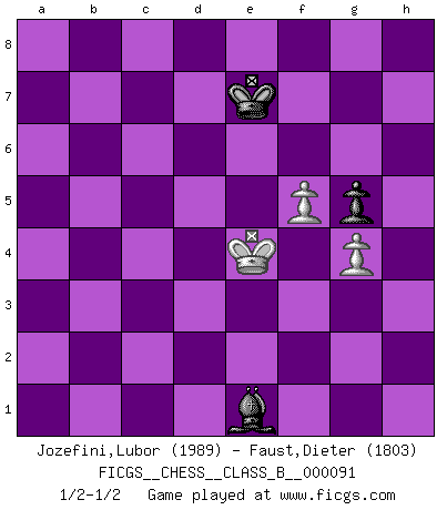 Last move : 1/2-1/2 2010 August 11 18:23:2 [Event "FICGS__CHESS__CLASS_B__000091"] [Site "FICGS"] [Date "2009.11.27"] [Round "1"] [White "Jozefini,Lubor"] [Black "Faust,Dieter"] [Result "1/2-1/2"] [WhiteElo "1989"] [BlackElo "1803"] 1.e4 Nf6 2.e5 Nd5 3.c4 Nb6 4.c5 Nd5 5.Bc4 c6 6.Nc3 d6 7.Qb3 Nd7 8.Bxd5 cxd5 9.cxd6 Nxe5 10.d4 Nd3+ 11.Ke2 Nxc1+ 12.Rxc1 e6 13.Qa4+ Bd7 14.Nb5 f6 15.Nf3 Kf7 16.Qb3 a6 17.Nc7 Rc8 18.Qxb7 Rb8 19.Qxa6 Bc8 20.Qd3 Rxb2+ 21.Rc2 Rxc2+ 22.Qxc2 Bxd6 23.Nb5 Ba6 24.a4 Qa5 25.Rb1 Rc8 26.Qd1 Be7 27.Nd2 g6 28.f4 Rc3 29.Nf3 Ra3 30.Kf2 Rxa4 31.Nc3 Ra3 32.Rb3 Bd6 33.g3 Bb4 34.Rxa3 Qxa3 35.Ne2 Qb2 36.h3 Bd6 37.h4 e5 38.dxe5 Bc5+ 39.Ke1 d4 40.exf6 Kxf6 41.Nfxd4 Qb4+ 42.Qd2 Qb1+ 43.Kf2 Bxe2 44.Kxe2 Qe4+ 45.Qe3 Qxd4 46.Qxd4+ Bxd4 47.g4 Bc3 48.Kf2 h6 49.Ke3 Kf7 50.Kf2 Bd2 51.Kf3 Be1 52.f5 g5 53.hxg5 hxg5 54.Ke4 Ke7 1/2-1/2 Alekhine's defense : Two pawns' (Lasker's) attack 10 pieces endgame at move 45 : White KQPPP , Black KQBPP WHITE : King + 1 Queen 3 Pawns BLACK : King + 1 Queen 1 Bishop 2 Pawns 9 pieces endgame at move 46 : White KQPPP , Black KBPP WHITE : King + 1 Queen 3 Pawns BLACK : King + 1 Bishop 2 Pawns 8 pieces endgame at move 46 : White KPPP , Black KBPP WHITE : King + 3 Pawns BLACK : King + 1 Bishop 2 Pawns 7 pieces endgame at move 53 : White KPPP , Black KBP WHITE : King + 3 Pawns BLACK : King + 1 Bishop 1 Pawn 6 pieces endgame at move 53 : White KPP , Black KBP WHITE : King + 2 Pawns BLACK : King + 1 Bishop 1 Pawn This chess game ended in a draw. Follow this game move after move (download)Don't even mention losing to me. I can't stand to think of it. (Bobby Fischer) Wenn ich mich einlogge, glauben die Leute gewöhnlich nicht, dass ich es selbst bin und sie fangen an, mir dumme Fragen zu stellen. Und wenn sie es glauben, stellen sie wieder andere dumme Fragen. (Judith Polgar) Yo no le temo a Spassky. Todos saben que yo soy el mejor. Uno no necesita un torneo para probarlo. (Bobby Fischer) Dieu déplace le joueur, et celui-ci la pièce. Quel Dieu derrière Dieu commence donc la trame ? Arturo Perez-Reverte (prix de littérature policière 1993). No, I am still playing. (Anatoly Karpov)