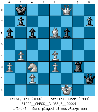 Last move : 1/2-1/2 2010 April 27 22:9:57 [Event "FICGS__CHESS__CLASS_B__000091"] [Site "FICGS"] [Date "2009.11.27"] [Round "1"] [White "Kelbl,Jiri"] [Black "Jozefini,Lubor"] [Result "1/2-1/2"] [WhiteElo "1800"] [BlackElo "1989"] 1.e4 e5 2.Nf3 Nc6 3.Bb5 Nd4 4.Nxd4 exd4 5.O-O c6 6.Ba4 Nf6 7.d3 d5 8.Bg5 dxe4 9.dxe4 Qa5 10.Bxf6 gxf6 11.Qxd4 Rg8 12.Qc4 Bd7 13.Bb3 Qh5 14.g3 Bh3 15.Nc3 Bxf1 16.Rxf1 O-O-O 17.Qxf7 Rg6 18.Be6+ Kb8 19.a3 Bc5 20.Kg2 a6 21.b4 Be3 22.fxe3 Rd2+ 23.Rf2 Rxf2+ 24.Kxf2 Qxh2+ 25.Kf1 Rxg3 26.Qf8+ Ka7 27.Qc5+ Kb8 28.Qf8+ Ka7 29.Qc5+ Kb8 30.Qf8+ 1/2-1/2 Ruy Lopez : Bird's defense Kingside Castling by player White (move 5) Queenside Castling by player Black (move 16) This chess game ended in a draw. Follow this game move after move (download)Chess is no whit inferior to the violin, and we have a large number of professional violinists. (Mikhail Botvinnik) Schach verlangt totale Konzentration. (Robert James Fischer) Tu sabes que vas a perder. Aún cuando tenía la ventaja, yo sabía que iba a perder. - al estar jugando con Fischer (Andrew Soltis) Celui qui prend des risques peut perdre, celui qui n'en prend pas perd toujours. (Xavier Tartacover) However beautiful the strategy, you should occasionally look at the results. (Winston Churchill)