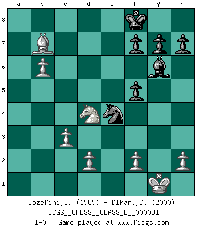 Last move : 1-0 2010 March 29 20:30:31 [Event "FICGS__CHESS__CLASS_B__000091"] [Site "FICGS"] [Date "2009.11.27"] [Round "1"] [White "Jozefini,Lubor"] [Black "Dikant,Christophe"] [Result "1-0"] [WhiteElo "1989"] [BlackElo "2000"] 1.e4 d5 2.exd5 Qxd5 3.Nc3 Qd6 4.g3 Nf6 5.Bg2 c6 6.Nge2 Bf5 7.b4 e6 8.b5 Be7 9.a4 O-O 10.Ba3 Qd8 11.Bxe7 Qxe7 12.O-O Nd5 13.Nd4 Bg6 14.Nxd5 cxd5 15.Re1 Qc5 16.Qg4 a6 17.c3 Qd6 18.Qf4 Qxf4 19.gxf4 axb5 20.axb5 Nd7 21.Rxa8 Rxa8 22.f5 exf5 23.Bxd5 Nc5 24.Re7 Rb8 25.Rc7 Ne4 26.b6 Kf8 27.Rxb7 Rxb7 28.Bxb7 1-0 Scandinavian : Pytel-Wade variation Kingside Castling by player Black (move 9) Kingside Castling by player White (move 12) Player White won this chess game. Follow this game move after move (download)Chess is the gymnasium of the mind. (Blaise Pascal) Ich bin stolz ein Bulgare zu sein. (Veselin Topalov) La señal de un Gran Maestro es su habilidad de ganar una partida rápidamente y sin dolor. (Irving Chernev) Le système Elo représente seulement une moyenne. Il est simplement un indicateur de votre stabilité. (Anatoli Karpov) Philosophers use a language that is already deformed as though by shoes that are too tight. (Ludwig Wittgenstein)