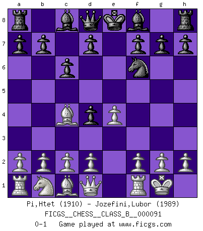 Last move : 0-1 2010 February 20 21:8:57 [Event "FICGS__CHESS__CLASS_B__000091"] [Site "FICGS"] [Date "2009.11.27"] [Round "1"] [White "Pi,Htet"] [Black "Jozefini,Lubor"] [Result "0-1"] [WhiteElo "1910"] [BlackElo "1989"] 1.e4 e5 2.Nf3 Nc6 3.Bb5 Nd4 4.Nxd4 exd4 5.O-O c6 6.Bc4 Nf6 0-1 Ruy Lopez : Bird's defense Kingside Castling by player White (move 5) Player Black won this chess game. Follow this game move after move (download)Tactics flow from a superior position. (Bobby Fischer) Der Umstand, daß uns eine 7 Stunden Zeitkontrolle ermöglicht eine großartige, tiefe Partie zu spielen, ist für die Massenmedien nicht weiter von Bedeutung. (Alexej Shirov) Al jugar al Ajedrez entonces, podemos aprender: Primero: Previsión... Segundo: Prudencia... Tercero: Cautela... Y al final, aprendemos del Ajedrez el hábito de no ser desanimados por apariencias malas presentes en el estado de nuestros asuntos, el hábito de la esperanza por una oportunidad favorable y la perseveración de los secretos de los recursos. (Benjamin Franklin) Le temps de noter son nom sur la feuille de partie, j'étais déjà en zeitnot ! D'un modeste amateur apparié lors de la première ronde d'un open contre le grand-maître Azmaïparashvili. If only faces could talk... (Pat Summerall, Sportscaster during the Super Bowl)