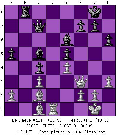 Last move : 1/2-1/2 2010 February 17 12:59:0 [Event "FICGS__CHESS__CLASS_B__000091"] [Site "FICGS"] [Date "2009.11.27"] [Round "1"] [White "De Waele,Willy"] [Black "Kelbl,Jiri"] [Result "1/2-1/2"] [WhiteElo "1975"] [BlackElo "1800"] 1.e4 e5 2.Nf3 Nc6 3.Bb5 a6 4.Ba4 Nf6 5.O-O Be7 6.Re1 b5 7.Bb3 d6 8.c3 O-O 9.h3 Na5 10.Bc2 c5 11.d4 Qc7 12.Nbd2 Bd7 13.Nf1 Nc4 14.b3 Nb6 15.Ne3 c4 16.bxc4 Nxc4 17.Nxc4 bxc4 18.Ba3 Rfe8 19.Rb1 Bf8 20.Qd2 Rab8 21.Bb4 a5 22.Ba3 Bc6 23.Rxb8 Rxb8 24.Qe3 Bd7 25.Rd1 h6 26.Nh4 Be6 27.d5 Bd7 28.Qf3 Qc8 29.Bc1 Be7 30.Qe2 Nxd5 31.Rxd5 Bxh4 32.Rxd6 Qc7 33.Rd5 Be6 34.Rd1 Be7 35.Qf3 Bc5 1/2-1/2 Ruy Lopez : Closed Kingside Castling by player White (move 5) Kingside Castling by player Black (move 8) This chess game ended in a draw. Follow this game move after move (download)Chess is thirty to forty percent psychology. You don't have this when you play a computer. I can't confuse it. (Judith Polgar) Ich verstehe Aljechins Kombinationen ganz gut; aber woher er diese Angriffschancen bekommt und wie er die Eröffnung behandelt das ist für mich ein Buch mit sieben Siegeln. (Rudolf Spielmann) No solamente yo pronostico su triunfo sobre Botvinnik, sino que me adelanto y digo que probablemente Fischer es el jugador de Ajedrez mas grande que haya existido. (John Collins) Les échecs sont un jeu par leur forme, un art par leur essence et une science par sa difficulté d'acquisition. Ils peuvent vous procurer autant de plaisir qu'un bon livre ou une belle musique, mais vous n'aurez une réelle joie que si vous arrivez à bien jouer. (Tigran Petrosian) Every vice is only an exaggeration of a necessary and virtuous function. (Ralph Waldo Emerson, Journals 1936)
