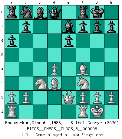 Last move : 1-0 2006 October 15 2:57:55 [Event "FICGS__CHESS__CLASS_B__000006"] [Site "FICGS"] [Date "2006.10.05"] [Round "1"] [White "Bhandarkar,Dinesh"] [Black "Stibal,George"] [Result "1-0"] [WhiteElo "1986"] [BlackElo "2070"] 1.e4 c6 2.d4 d5 3.exd5 cxd5 4.c4 Nf6 5.Nc3 e6 6.Nf3 Be7 7.Bd3 O-O 8.O-O a6 9.cxd5 Nxd5 10.Qe2 Nf4 11.Bxf4 1-0 Caro-Kann : Panov-Botvinnik attack, 5...e6 Kingside Castling by player Black (move 7) Kingside Castling by player White (move 8) Player White won this chess game. Follow this game move after move (download)The Pawns are the soul of the game. (Francois Andre Danican Philidor) Ich möchte Schüler heranbilden, die das Vermögen haben, selbst zu denken und Kritik zu üben. (Emanuel Lasker) Repentinamente, me resultaba obvio en mi analisis que yo había pasado por alto lo que Fischer había visto en el tablero con la mas grande facilidad. (Mikhail Botvinnik) Il (Jacob Murray) ne joue pas pour le bon coup, mais pour le meilleur. (Eloi Relange) What doesn't kill us makes us stronger. (Friedrich Nietzsche)
