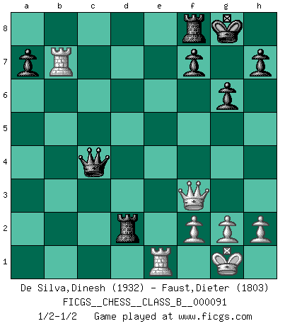 Last move : 1/2-1/2 2010 June 21 11:14:18 [Event "FICGS__CHESS__CLASS_B__000091"] [Site "FICGS"] [Date "2009.11.27"] [Round "1"] [White "De Silva,Dinesh"] [Black "Faust,Dieter"] [Result "1/2-1/2"] [WhiteElo "1932"] [BlackElo "1803"] 1.e4 Nf6 2.e5 Nd5 3.d4 d6 4.Nf3 dxe5 5.Nxe5 g6 6.Bc4 c6 7.O-O Bg7 8.Re1 O-O 9.Bb3 Be6 10.Nd2 Nd7 11.Ndf3 Nxe5 12.Nxe5 Qd6 13.c3 Rad8 14.Qf3 c5 15.dxc5 Qxc5 16.Bg5 Nc7 17.Bf4 Bxb3 18.axb3 Ne6 19.Bg3 Qb6 20.b4 Bxe5 21.Bxe5 Rd2 22.c4 Nd4 23.Bxd4 Qxd4 24.Rxe7 Qxb2 25.Rae1 Qxb4 26.Rxb7 Qxc4 1/2-1/2 Alekhine's defense : Modern, Larsen variation Kingside Castling by player White (move 7) Kingside Castling by player Black (move 8) This chess game ended in a draw. Follow this game move after move (download)Only sissies Castle. (Rob Sillars) Im Fernschach kannst du während dem Spiel rauchen. (John Christen Knudsen) Bobby solo arroja las piezas y solas caen en las casillas correctas. (Miguel Najdorf ) Il n'y a plus de joueurs du niveau de Jacob Murray dont la seule quête est le beau jeu, le plaisir de voir les pièces construire quelque chose. Sur 10 idées à la minute, 9 seront sans intérêt, la dernière s'avèrera géniale. (Christian Bauer) Hold em is to stud what chess is to checkers. (Johnny Moss)