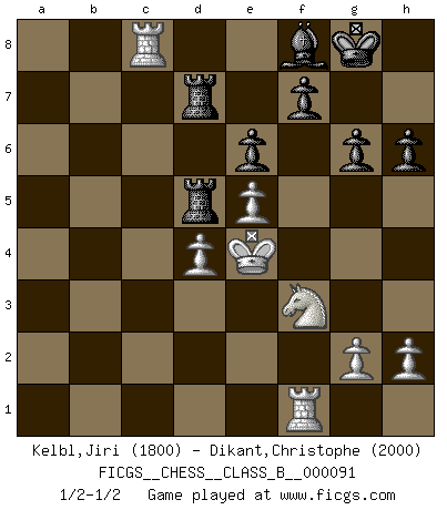 Last move : 1/2-1/2 2010 March 18 19:1:46 [Event "FICGS__CHESS__CLASS_B__000091"] [Site "FICGS"] [Date "2009.11.27"] [Round "1"] [White "Kelbl,Jiri"] [Black "Dikant,Christophe"] [Result "1/2-1/2"] [WhiteElo "1800"] [BlackElo "2000"] 1.e4 g6 2.d4 Bg7 3.Nc3 c6 4.Be3 d5 5.Qd2 dxe4 6.Nxe4 Nd7 7.O-O-O Ngf6 8.Ng3 Nb6 9.Nf3 Be6 10.Ng5 Bc4 11.b3 Bxf1 12.Rhxf1 Nbd5 13.c4 Nxe3 14.fxe3 O-O 15.e4 h6 16.Nf3 Nd7 17.Ne2 Qc7 18.Kb1 a5 19.Nc3 Nb6 20.a4 Nd7 21.e5 e6 22.Ne4 b5 23.cxb5 cxb5 24.axb5 a4 25.Rc1 Qa7 26.Qa2 axb3 27.Qxa7 Rxa7 28.Kb2 Rb8 29.Nc3 Nb6 30.Kxb3 Nd5 31.Nxd5 Rxb5+ 32.Kc4 Rxd5 33.Kd3 Rad7 34.Ke4 Bf8 35.Rc8 1/2-1/2 Robatsch defense Queenside Castling by player White (move 7) Kingside Castling by player Black (move 14) This chess game ended in a draw. Follow this game move after move (download)Avoid the crowd. Do your own thinking independently. Be the Chess player, not the Chess piece. (Ralph Charell) Kein Großmeister ist normal. Sie unterscheiden sich nur im Ausmaß Ihrer Verrücktheit. (Viktor Kortschnoi) Un sacrificio se refuta mucho mejor al aceptarlo. (Wilhelm Steinitz) Les écrivains ont utilisé les échecs pour analyser les côtés extrêmes de la nature humaine. Dans ce cadre, les échecs offrent un champ d'expérimentation idéal. Mais on pourrait faire la même chose avec la peinture. Et là, en vous référant à Van Gogh, vous ne tirerez pas de conclusion définitive sur les peintres. (Gary Kasparov) Horse racing is animated roulette. (Roger Kahn)