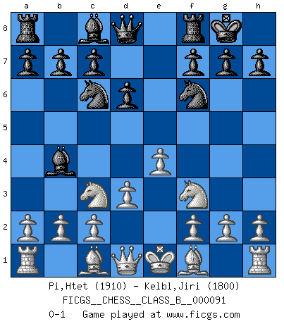 Last move : 0-1 2010 February 18 20:57:15 [Event "FICGS__CHESS__CLASS_B__000091"] [Site "FICGS"] [Date "2009.11.27"] [Round "1"] [White "Pi,Htet"] [Black "Kelbl,Jiri"] [Result "0-1"] [WhiteElo "1910"] [BlackElo "1800"] 1.e4 e5 2.Nf3 Nf6 3.Nc3 Bb4 4.Nxe5 d6 5.Nf3 O-O 6.d3 Nc6 0-1 Petrov Three knights game Kingside Castling by player Black (move 5) Player Black won this chess game. Follow this game move after move (download)Some sacrifices are sound; the rest are mine. (Mikhail Tal) Ein unbeabsichtigtes Patt ist der Gipfel der Dummheit. (Anonymous) Un buen jugador siempre tiene buena suerte. (José Raúl Capablanca) Nous vivons dans un monde échiquéen : chaque jour qui passe est un défi à relever. (Philosophe Sasha) When you have everything, sometimes it feels like nothing. (Horatio Caine, C.S.I. Miami)