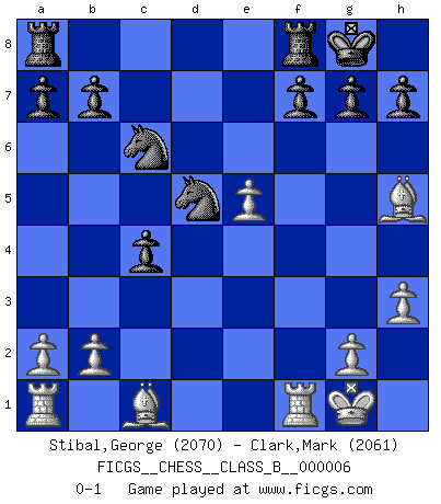 Last move : 0-1 2006 October 26 3:34:57 [Event "FICGS__CHESS__CLASS_B__000006"] [Site "FICGS"] [Date "2006.10.05"] [Round "1"] [White "Stibal,George"] [Black "Clark,Mark"] [Result "0-1"] [WhiteElo "2070"] [BlackElo "2061"] 1.e4 Nf6 2.e5 Nd5 3.c4 Nb6 4.d4 d6 5.f4 dxe5 6.fxe5 c5 7.d5 e6 8.Nc3 exd5 9.cxd5 c4 10.Nf3 Bg4 11.Be2 Bb4 12.O-O O-O 13.h3 Bh5 14.Nd4 Bxc3 15.Bxh5 Bxd4+ 16.Qxd4 Nc6 17.Qe4 Qxd5 18.Qxd5 Nxd5 0-1 Alekhine's defense Kingside Castling by player White (move 12) Kingside Castling by player Black (move 12) Player Black won this chess game. Follow this game move after move (download)I play correspondence chess because it is both art and science while chess is art only. (A player at FICGS) Ich spiele 70 Eröffnungssysteme. (Viktor Kortschnoi) Robert Fischer es la ley hacia si mismo. (Larry Evans) Même si l'adversaire joue le coup analysé précédemment, recommencez l'analyse en voyant la nouvelle position. Première règle de Blumenfeld Quotation,n.: The act of repeating erroneously the words of another. The words erroneously repeated. (Ambrose Bierce, The Devil's Dictionary)