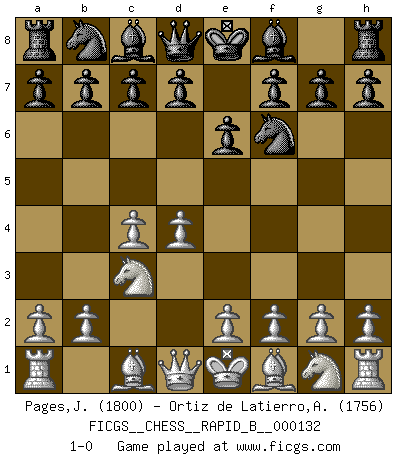 Last move : 1-0 2009 December 30 20:17:39 [Event "FICGS__CHESS__RAPID_B__000132"] [Site "FICGS"] [Date "2009.11.27"] [Round "1"] [White "Pages,Jeremy"] [Black "Ortiz de Latierro,Aitor"] [Result "1-0"] [WhiteElo "1800"] [BlackElo "1756"] 1.d4 Nf6 2.c4 e6 3.Nc3 1-0 This chess game has been lost on time (started : 2009.11.27 9:14:56) Queen's pawn game Player White won this chess game. Follow this game move after move (download)The blunders are all there on the board, waiting to be made. (Savielly Tartakover) Der Knackpunkt bei der Konzentration ist, daß wir nur durch sie etwas Neues und Ungewöhnliches am Schachbrett finden können. Sie ist der einzige Weg durch neue neue Ideen eine Überraschung zu bereiten. (Garry Kasparov) La estratégia requiere pensar, la táctica requiere observación. (Max Euwe) Seul un grand joueur sait à quel point il joue faiblement. (Xavier Tartacover) A belief is an idea the mind possesses, an idea that possesses the mind. (Robert Oxden Bolton)