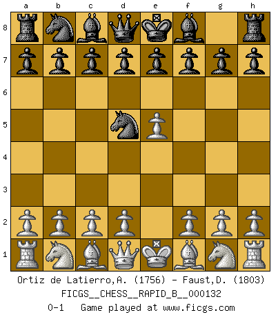 Last move : 0-1 2009 December 31 8:18:31 [Event "FICGS__CHESS__RAPID_B__000132"] [Site "FICGS"] [Date "2009.11.27"] [Round "1"] [White "Ortiz de Latierro,Aitor"] [Black "Faust,Dieter"] [Result "0-1"] [WhiteElo "1756"] [BlackElo "1803"] 1.e4 Nf6 2.e5 Nd5 0-1 This chess game has been lost on time (started : 2009.11.27 9:14:56) Alekhine's defense Player Black won this chess game. Follow this game move after move (download)Any material change in a position must come about by mate, a capture, or a Pawn promotion. (Purdy) Ich würde die 30 stärksten Spieler der USA im Simultanspiel besiegen. (José Raúl Capablanca) Morphy probablemente fue el genio más grande de todos. (Bobby Fischer) Il vaut toujours mieux jouer un plan faux de façon logique que de n'avoir pas de plan du tout. (Victor Kortchnoï) Man is still the most extraordinary computer of all. (John F. Kennedy)