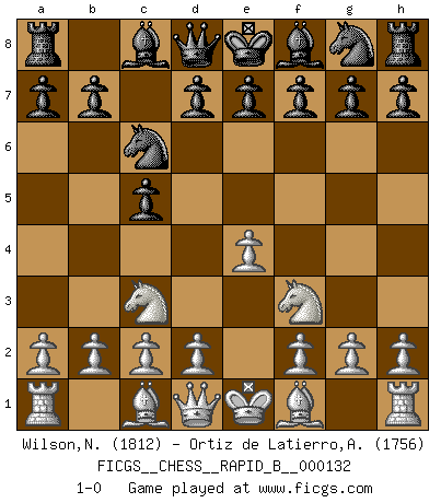 Last move : 1-0 2009 December 31 8:18:31 [Event "FICGS__CHESS__RAPID_B__000132"] [Site "FICGS"] [Date "2009.11.27"] [Round "1"] [White "Wilson,Norman"] [Black "Ortiz de Latierro,Aitor"] [Result "1-0"] [WhiteElo "1812"] [BlackElo "1756"] 1.e4 c5 2.Nc3 Nc6 3.Nf3 1-0 This chess game has been lost on time (started : 2009.11.27 9:14:56) Sicilian : Closed, 2...Nc6 Player White won this chess game. Follow this game move after move (download)Fischer is the strongest player in the world. In fact, the strongest player who ever lived. (Larry Evans) Schach ist wie eine schöne Frau, zu der wir ständig zurückkehren, gleichviel, wie oft sie uns zurückweist. (Anonymous) Bobby solo arroja las piezas y solas caen en las casillas correctas. (Miguel Najdorf ) 'L'échange des dames est un coup dur pour les deux adversaires...' Un journaliste lors d'une partie du match Spassky-Fischer Empty your mind, be formless, shapeless — like water. (Bruce Lee)
