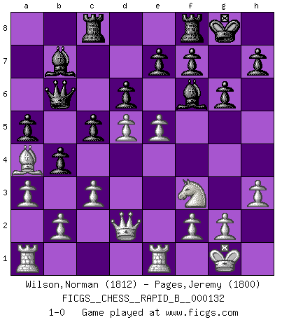 Last move : 1-0 2010 February 11 8:31:1 [Event "FICGS__CHESS__RAPID_B__000132"] [Site "FICGS"] [Date "2009.11.27"] [Round "1"] [White "Wilson,Norman"] [Black "Pages,Jeremy"] [Result "1-0"] [WhiteElo "1812"] [BlackElo "1800"] 1.e4 d6 2.d4 Nf6 3.Nc3 g6 4.Nf3 Bg7 5.Be2 c6 6.Bd2 O-O 7.h3 Nbd7 8.Bg5 b5 9.Bxf6 Bxf6 10.O-O Bb7 11.Re1 Qc7 12.a3 a5 13.Qd2 b4 14.Na4 c5 15.Bb5 Nb6 16.c3 Nxa4 17.Bxa4 Qb6 18.d5 Rac8 19.e5 1-0 This chess game has been lost on time (started : 2009.11.27 9:14:56) Pirc : Classical system, 5.Be2 Kingside Castling by player Black (move 6) Kingside Castling by player White (move 10) Player White won this chess game. Follow this game move after move (download)The chessboard is the world, the pieces are the phenomena of the Universe, the rules of the game are what we call the laws of Nature and the player on the other side is hidden from us. (Thomas Huxley) Kasparov stellt für gewöhnlich die Regeln auf und bricht sie dann selbst wieder. (Alexej Shirov) Hay jugadores fuertes y personas amables y yo soy un jugador fuerte. (Bobby Fischer) Le joueur d'Echecs qui veut atteindre le top est obligé de développer son propre credo créatif. Alexeï Stepanovicth Souétine. Il est facile d'écrire des livres ! Ce qui est difficile, c'est de jouer ! (Alexeï Stepanovicth Souétine) If you lose the game you should win the analysis! (Proverb)
