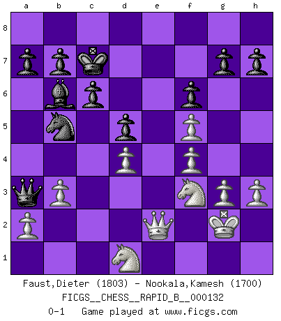 Last move : 0-1 2010 January 11 16:42:10 [Event "FICGS__CHESS__RAPID_B__000132"] [Site "FICGS"] [Date "2009.11.27"] [Round "1"] [White "Faust,Dieter"] [Black "Nookala,Kamesh"] [Result "0-1"] [WhiteElo "1803"] [BlackElo "1700"] 1.d4 Nf6 2.c4 e6 3.Nf3 d5 4.Bg5 Be7 5.cxd5 exd5 6.Nc3 c6 7.e3 Bf5 8.Bd3 Bxd3 9.Qxd3 O-O 10.O-O Nbd7 11.Bf4 Nh5 12.Rfe1 Nb6 13.h3 Nxf4 14.exf4 Re8 15.Re2 Bd6 16.Rxe8+ Qxe8 17.Re1 Qc8 18.f5 Qd7 19.Ne5 Re8 20.f4 Qc8 21.g3 f6 22.Nf3 Bb4 23.Rxe8+ Qxe8 24.Nd1 Nc4 25.b3 Nd6 26.Nf2 Qe7 27.Kh2 Ba5 28.Kg2 Kf7 29.Kf1 Ke8 30.Kg2 Nb5 31.Kf1 Kd7 32.Kg2 Qa3 33.Qe2 Kc7 34.Nd1 Bb6 0-1 Queen's pawn game Kingside Castling by player Black (move 9) Kingside Castling by player White (move 10) Player Black won this chess game. Follow this game move after move (download)I won't play with you anymore. You have insulted my friend. - When an opponent cursed himself for a blunder. (Miguel Najdorf) Warum muß ich gegen diesen IDIOTEN verlieren? (Aaron Nimzowitsch) Dejen al perfeccionista jugar por correo. (Yasser Seirawan) Que feriez-vous si vous étiez en train de jouer aux échecs et que la fin du monde arrive ? Je continuerais à jouer. (Saint Borromée) 98% of all statistics are made up. (Author unknown)