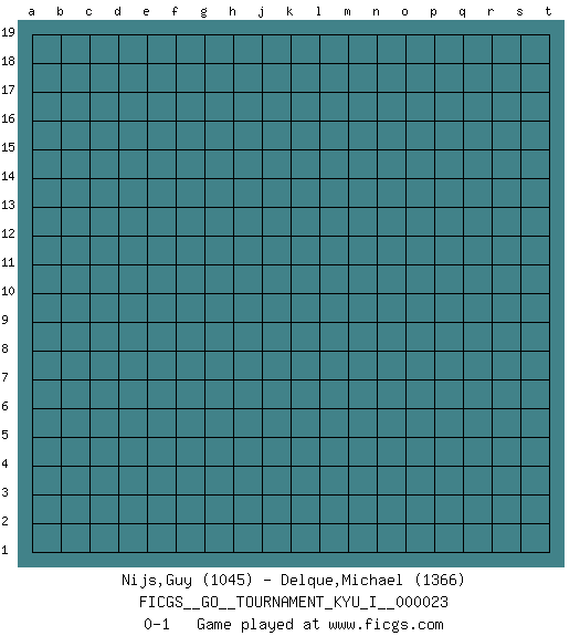 Last move : 0-1 2009 December 29 8:16:36 [Event "FICGS__GO__TOURNAMENT_KYU_I__000023"] [Site "FICGS"] [Date "2009.11.29"] [Round "1"] [Black "Nijs,Guy"] [White "Delque,Michael"] [Result "0-1"] [Rating 1 "1045"] [Rating 2 "1366"] 0-1 This go game has been lost on time (started : 2009.11.29 2:50:46) Here are the names of the openings (joseki) played in the four corners : Player White won this Go (weiqi, baduk) game. Follow this game move after move (download)Go is not a blocking game, it's a game of action. (Pierre Audouard) Somehow our devils are never quite what we expect when we meet them face to face. (Nelson DeMille)