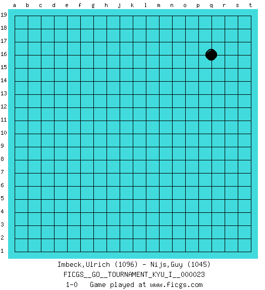 Last move : 1-0 2009 December 29 8:16:36 [Event "FICGS__GO__TOURNAMENT_KYU_I__000023"] [Site "FICGS"] [Date "2009.11.29"] [Round "1"] [Black "Imbeck,Ulrich"] [White "Nijs,Guy"] [Result "1-0"] [Rating 1 "1096"] [Rating 2 "1045"] 1.q16 1-0 This go game has been lost on time (started : 2009.11.29 2:50:46) Here are the names of the openings (joseki) played in the four corners : Player Black won this Go (weiqi, baduk) game. Follow this game move after move (download)Beware of the clumsy double contact. (Anonymous) The smarter you play, the luckier you'll be. (Mark Pilarski)