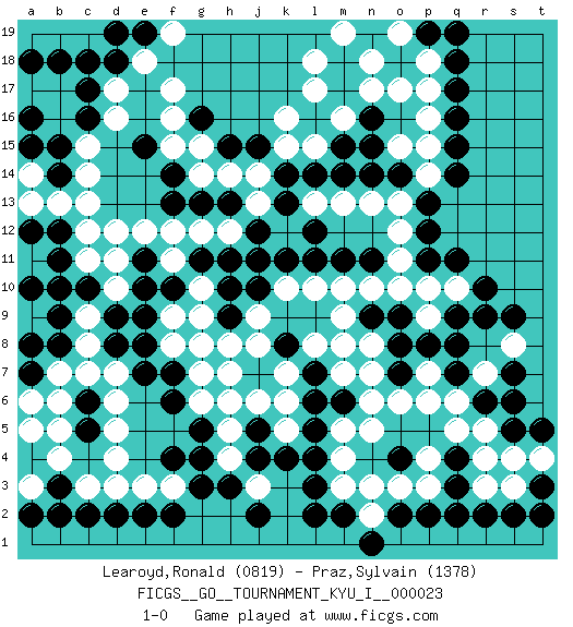 Last move : 1-0 2010 February 16 13:48:31 [Event "FICGS__GO__TOURNAMENT_KYU_I__000023"] [Site "FICGS"] [Date "2009.11.29"] [Round "1"] [Black "Learoyd,Ronald"] [White "Praz,Sylvain"] [Result "1-0"] [Rating 1 "0819"] [Rating 2 "1378"] 1.q16 d16 2.q3 d4 3.r9 o17 4.q14 k16 5.f4 d6 6.k4 q5 7.o4 r3 8.r2 r4 9.s2 r7 10.o7 p3 11.q2 p4 12.p2 o3 13.o2 n3 14.q18 h4 15.f6 k5 16.l5 k6 17.l3 n5 18.l6 k7 19.m2 f8 20.h3 j3 21.j4 h5 22.g3 g7 23.e7 d7 24.e8 k10 25.d8 d11 26.c17 d17 27.c16 c15 28.b15 c14 29.b14 c13 30.d18 e18 31.c18 f17 32.n15 m16 33.e10 d10 34.d9 f9 35.e9 p15 36.q15 o15 37.n14 o13 38.o14 p14 39.p13 p17 40.q17 o12 41.p12 o11 42.q11 p9 43.q8 f11 44.f10 g10 45.e11 e12 46.g11 f12 47.h10 g9 48.h11 j8 49.k11 l10 50.l11 m10 51.m11 n10 52.h9 h8 53.n11 o10 54.j10 j13 55.j12 h12 56.h13 g12 57.k13 j14 58.l12 l13 59.k14 k15 60.l14 m13 61.j15 h14 62.g13 n13 63.n16 n17 64.m17 l17 65.m18 n18 66.h15 g14 67.f13 d12 68.l16 l15 69.m15 l18 70.l16 m19 71.m14 m16 72.j5 j6 73.l7 s3 74.s5 s8 75.s9 d3 76.b9 b7 77.c5 d5 78.b2 b4 79.d2 c3 80.c2 e3 81.f7 g8 82.h6 g6 83.k8 h7 84.g5 j9 85.j11 l8 86.t3 t4 87.t2 s4 88.r6 q6 89.s7 r5 90.s6 n7 91.q7 o6 92.o8 n8 93.o9 m4 94.l4 m3 95.l2 q10 96.r10 m8 97.e2 f3 98.f2 b13 99.b3 b5 100.c6 b6 101.b8 c7 102.a4 h6 103.g4 a5 104.a7 b10 105.a10 a11 106.b11 a9 107.c10 c11 108.a10 b16 109.a16 b10 110.f14 g15 111.a10 b17 112.b18 b10 113.g16 f15 114.a10 a17 115.a18 b10 116.e15 f16 117.a10 c9 118.b10 c8 119.a12 a13 120.b12 c12 121.p11 p10 122.t5 n2 123.n1 a3 124.a2 a6 125.a8 p18 126.q19 a14 127.a15 p7 128.p8 p6 129.n9 m9 130.q9 p16 131.p19 o19 132.m6 n6 133.e19 f19 134.d19 m5 135.q4 m7 136.j2 1-0 Here are the names of the openings (joseki) played in the four corners : Corner q16 : q16 o17 Hoshi (Hwajeom, Seongjeom, Xingwei`) 4-4 Point. The star or hoshi (4-4) point, emphasizing influence at the potential expense of territory. Ikken Kakari (Hankan Keolch'im, Yi Gua`jiao~, 1-Space Low Approach). White 2 is the standard approach move to the 4-4. Corner d4 : d4 f4 Hoshi (Hwajeom, Seongjeom, Xingwei`) 4-4 Point. The star or hoshi (4-4) point, emphasizing influence at the potential expense of territory. Ikken Takagakari (Hankan Nop'dakeolch'im, Yi Gaojia, 1-Space High Approach). White typically responds at 6-4 or 3-10. White 4-10 is played when White finds play on the right side advantageous. White 4-8 or 3-8 may be played when White has support at top. Player Black won this Go (weiqi, baduk) game. Follow this game move after move (download)With only one group, you will win. (Anonymous) Art is the triumph over chaos. (John Cheever)