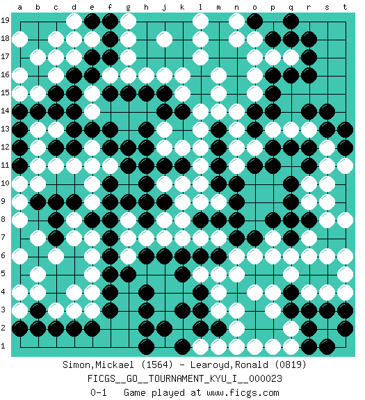 Last move : 0-1 2010 March 25 22:1:41 [Event "FICGS__GO__TOURNAMENT_KYU_I__000023"] [Site "FICGS"] [Date "2009.11.29"] [Round "1"] [Black "Simon,Mickael"] [White "Learoyd,Ronald"] [Result "0-1"] [Rating 1 "1564"] [Rating 2 "0819"] 1.q16 d4 2.q4 d17 3.q10 c11 4.f3 c6 5.d2 c3 6.c2 j3 7.f5 m3 8.o3 j5 9.c15 f16 10.c17 c18 11.d16 b17 12.e17 d18 13.e16 c16 14.b16 e18 15.f17 e7 16.f15 g16 17.g15 h16 18.h15 j16 19.j15 k16 20.l15 c17 21.d9 e11 22.f9 g7 23.h9 c13 24.h6 h7 25.j6 l5 26.k6 j8 27.j9 k8 28.l6 g6 29.g5 h5 30.k5 k4 31.h3 m5 32.m6 n5 33.l8 k9 34.j11 l10 35.n8 n6 36.n7 q6 37.r5 r6 38.m10 l11 39.m11 l12 40.m12 l13 41.l16 l17 42.m17 l18 43.m18 k15 44.k14 l14 45.j14 j18 46.h8 j7 47.c9 b15 48.b14 a16 49.c14 j12 50.h12 e14 51.d13 b13 52.a13 b11 53.d12 d11 54.f12 e12 55.e13 f11 56.g12 e9 57.e8 e10 58.f8 d8 59.f7 e6 60.f6 e5 61.h4 j4 62.j2 k2 63.h2 n2 64.o2 n3 65.c8 d7 66.b6 b5 67.c7 b7 68.b3 b4 69.b2 m16 70.n16 m15 71.n15 n14 72.o14 n13 73.m13 m14 74.o13 n12 75.o11 o12 76.p12 n11 77.n10 l9 78.m8 q5 79.s5 s6 80.a11 a10 81.a12 b10 82.r17 p4 83.q3 p3 84.p2 o4 85.f18 g18 86.e19 d19 87.f19 r4 88.r3 s4 89.s3 t5 90.a14 a15 91.t3 p13 92.p11 o15 93.p14 o16 94.n17 o17 95.p18 o18 96.p15 o1 97.s1 q2 98.r2 p1 99.t2 s10 100.r12 s12 101.s13 s11 102.r11 r9 103.q9 q8 104.p8 p7 105.o7 o6 106.k1 l1 107.l2 j1 108.l4 m1 109.l3 p17 110.q18 q17 111.r16 e3 112.e2 d3 113.m19 n19 114.c12 b12 115.f13 g19 116.g11 g17 117.d14 p19 118.r18 l7 119.k3 k7 120.k11 k12 121.f10 a8 122.t12 t11 123.t13 m7 124.r8 s8 125.q7 p6 126.s7 r7 127.q8 r10 128.k1 r13 129.r14 k2 130.a17 a18 131.k1 q13 132.s14 k2 133.a7 a6 134.k1 m9 135.n9 k2 136.t9 s9 137.k1 j10 138.h10 k10 139.h11 k2 140.t7 t6 141.k1 q11 142.q12 k2 143.t10 t8 144.k1 e15 145.d15 k2 146.b9 a9 147.k1 g8 148.h1 m4 149.m2 n1 150.q19 l19 151.f4 j13 152.h13 a3 153.a2 a4 154.p16 n18 155.g9 e4 156.r1 q1 157.o19 t4 0-1 Here are the names of the openings (joseki) played in the four corners : Corner d4 : d4 f3 Hoshi (Hwajeom, Seongjeom, Xingwei`) 4-4 Point. The star or hoshi (4-4) point, emphasizing influence at the potential expense of territory. Ikken Kakari (Hankan Keolch'im, Yi Gua`jiao~, 1-Space Low Approach). Black 2 is the standard approach move to the 4-4. Corner q4 : q4 m3 Hoshi (Hwajeom, Seongjeom, Xingwei`) 4-4 Point. The star or hoshi (4-4) point, emphasizing influence at the potential expense of territory. Player White won this Go (weiqi, baduk) game. Follow this game move after move (download)Don't reduce your own liberties. (Bill Taylor) Gambling is the son of avarice and the father of despair. (French proverb)