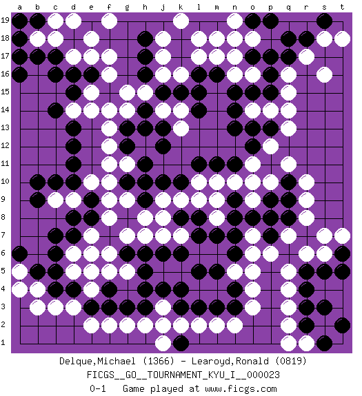 Last move : 0-1 2010 March 22 15:51:32 [Event "FICGS__GO__TOURNAMENT_KYU_I__000023"] [Site "FICGS"] [Date "2009.11.29"] [Round "1"] [Black "Delque,Michael"] [White "Learoyd,Ronald"] [Result "0-1"] [Rating 1 "1366"] [Rating 2 "0819"] 1.d4 q16 2.d16 q3 3.r5 q5 4.r4 q4 5.r3 r6 6.r2 q2 7.k4 f17 8.d13 j17 9.c10 r10 10.k10 c3 11.c4 d3 12.e3 e2 13.f3 f2 14.g3 b4 15.b5 b3 16.c6 s6 17.s5 r1 18.s1 q1 19.t2 j7 20.l7 p10 21.o8 q7 22.o17 m17 23.o15 q14 24.q18 r17 25.r18 s18 26.q17 s16 27.p16 q15 28.o13 p12 29.d18 e17 30.g10 f14 31.l15 n16 32.n15 d17 33.c17 c18 34.c16 b18 35.b17 j14 36.k17 k16 37.l16 l17 38.k15 j16 39.j15 h15 40.n3 d9 41.d10 c9 42.b10 n5 43.l5 g2 44.h3 h2 45.j2 j1 46.k1 k2 47.k3 j3 48.j4 l2 49.l3 m2 50.m3 n2 51.p13 q13 52.o12 o11 53.n11 n10 54.m11 m10 55.l11 m8 56.m7 o14 57.n14 k9 58.j10 j9 59.h9 h8 60.g8 g7 61.e9 f8 62.e8 e7 63.d7 e6 64.e5 d6 65.c7 f5 66.h4 d5 67.c5 e4 68.m5 o3 69.n4 o4 70.n6 o5 71.n18 m18 72.h14 g14 73.h13 l10 74.a18 d19 75.q8 r8 76.q9 r9 77.p7 p6 78.e19 e18 79.g13 f13 80.g12 f12 81.d12 d14 82.c14 e15 83.e16 f16 84.t6 s7 85.l8 g9 86.h10 o7 87.n8 p8 88.p9 m9 89.n7 o9 90.p7 s2 91.s3 p8 92.h16 g15 93.p7 e10 94.d8 p8 95.h17 j18 96.p7 o16 97.m16 n17 98.p15 p14 99.n13 p8 100.k18 k19 101.p7 o18 102.p17 p8 103.h18 l18 104.p7 f9 105.p8 f10 106.q10 q11 107.d15 e14 108.h6 l9 109.g6 f6 110.f4 h7 111.k8 j8 112.s19 t18 113.n9 o10 114.j6 g5 115.h5 g11 116.h11 f11 117.j13 k14 118.l14 k13 119.j12 o6 120.b19 f19 121.a19 a17 122.a16 c19 123.a17 e5 124.o19 n19 125.p19 k7 126.k6 t7 127.t5 a5 128.a6 a4 129.b9 j2 130.d11 n18 131.pass pass 0-1 Here are the names of the openings (joseki) played in the four corners : Corner q4 : q3 r5 Komoku (Somok, Xiao~mu`) 3-4 Point. The komoku (3-4) point is the traditional corner enclosure move.. Ikken Kakari (Hankan Keolch'im, Yi Gua`jiao~, 1-Space Low Pincer). The small knight move is the basic approach move to the 3-4 point stone. It has been continually used for over four centuries. There are limitless variations, with new moves constantly being discovered. Black 2 opens the door to a treaure store of joseki. Corner d16 : d16 f17 Hoshi (Hwajeom, Seongjeom, Xingwei`) 4-4 Point. The star or hoshi (4-4) point, emphasizing influence at the potential expense of territory. Ikken Kakari (Hankan Keolch'im, Yi Gua`jiao~, 1-Space Low Approach). White 2 is the standard approach move to the 4-4. Corner d4 : d4 c3 Hoshi (Hwajeom, Seongjeom, Xingwei`) 4-4 Point. The star or hoshi (4-4) point, emphasizing influence at the potential expense of territory. Corner q16 : q16 o17 Hoshi (Hwajeom, Seongjeom, Xingwei`) 4-4 Point. The star or hoshi (4-4) point, emphasizing influence at the potential expense of territory. Ikken Kakari (Hankan Keolch'im, Yi Gua`jiao~, 1-Space Low Approach). Black 2 is the standard approach move to the 4-4. Player White won this Go (weiqi, baduk) game. Follow this game move after move (download)If there is no stone on the handicap point, the carpenter's square is dead. (Anonymous) Locking firmely the window serves nothing, only small thiefs pass through there, the big thiefs enter through the front door. (Luc-Olivier Leclerc)