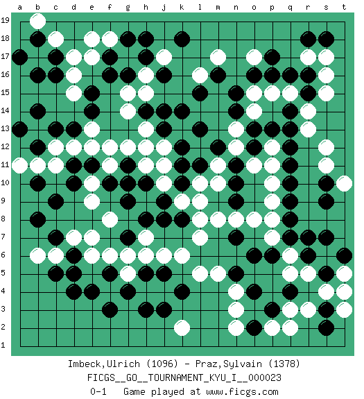 Last move : 0-1 2010 May 6 12:54:38 [Event "FICGS__GO__TOURNAMENT_KYU_I__000023"] [Site "FICGS"] [Date "2009.11.29"] [Round "1"] [Black "Imbeck,Ulrich"] [White "Praz,Sylvain"] [Result "0-1"] [Rating 1 "1096"] [Rating 2 "1378"] 1.q16 d16 2.d4 r3 3.p3 q5 4.q10 n3 5.k4 c6 6.d6 d7 7.c5 e6 8.d5 e7 9.f17 j17 10.h18 e18 11.k18 o17 12.p17 r14 13.q14 r17 14.r16 s16 15.s18 s17 16.r18 r13 17.r7 s6 18.r6 r5 19.d10 d12 20.c9 b6 21.b12 b13 22.c13 c12 23.b14 b11 24.a13 c11 25.f10 f12 26.d13 e13 27.b16 h11 28.g9 h7 29.g7 g6 30.h8 h6 31.g4 f4 32.f5 g5 33.f3 l5 34.o4 n4 35.o6 p7 36.p6 q6 37.q7 p8 38.q8 p9 39.q9 p10 40.s7 l7 41.n5 m5 42.n7 s11 43.q11 p11 44.q12 p12 45.q13 o14 46.n9 l9 47.k8 l8 48.n11 n12 49.l11 m10 50.n10 m11 51.m12 n13 52.l13 k9 53.j8 h4 54.e4 f6 55.h3 j4 56.j3 j10 57.j5 j6 58.h5 k6 59.b10 a11 60.e11 e12 61.g11 g12 62.h10 f11 63.g10 j12 64.j9 f8 65.k10 j11 66.b8 e9 67.c7 e10 68.l15 l16 69.n15 o15 70.m16 m17 71.o16 p15 72.p16 l10 73.k14 n8 74.k11 k13 75.j13 h13 76.k12 h12 77.d11 h15 78.e15 e17 79.f16 b17 80.c17 c18 81.b18 d17 82.c16 b19 83.a17 q15 84.r15 s15 85.s10 s12 86.s5 s4 87.t6 q2 88.q4 q3 89.o2 n2 90.s2 p2 91.t4 t3 92.s3 t5 93.p13 s6 94.o12 o11 95.o13 o8 96.n14 m8 97.s5 t4 98.h14 g14 99.j14 g15 100.j16 g17 101.g16 h16 102.h17 f18 103.g18 d15 104.e14 t10 105.s9 k2 0-1 Here are the names of the openings (joseki) played in the four corners : Corner q4 : r3 p3 San-San (Sam-Sam, San-San) 3-3 Point. The San-San (3-3) point, emphasizing territory at the expense of influence. Ikken Kakari (Hankan Keolch'im, Yi Gua`, Jiao~, 1-Space Approach). White may continue by playing 4-5, 3-5, 4-6, 3-6 or 5-4. Corner d4 : d4 c6 Hoshi (Hwajeom, Seongjeom, Xingwei`) 4-4 Point. The star or hoshi (4-4) point, emphasizing influence at the potential expense of territory. Ikken Kakari (Hankan Keolch'im, Yi Gua`jiao~, 1-Space Low Approach). White 2 is the standard approach move to the 4-4. Corner d16 : d16 f17 Hoshi (Hwajeom, Seongjeom, Xingwei`) 4-4 Point. The star or hoshi (4-4) point, emphasizing influence at the potential expense of territory. Ikken Kakari (Hankan Keolch'im, Yi Gua`jiao~, 1-Space Low Approach). Black 2 is the standard approach move to the 4-4. Corner q16 : q16 o17 Hoshi (Hwajeom, Seongjeom, Xingwei`) 4-4 Point. The star or hoshi (4-4) point, emphasizing influence at the potential expense of territory. Ikken Kakari (Hankan Keolch'im, Yi Gua`jiao~, 1-Space Low Approach). White 2 is the standard approach move to the 4-4. Player White won this Go (weiqi, baduk) game. Follow this game move after move (download)Stop on second, extend on third. (Anonymous) Every man's memory is his private literature. (Aldous Huxley)