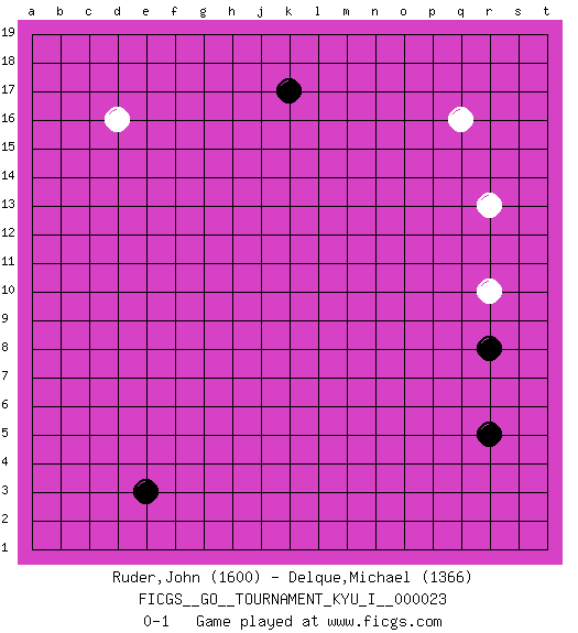 Last move : 0-1 2010 January 8 20:36:6 [Event "FICGS__GO__TOURNAMENT_KYU_I__000023"] [Site "FICGS"] [Date "2009.11.29"] [Round "1"] [Black "Ruder,John"] [White "Delque,Michael"] [Result "0-1"] [Rating 1 "1600"] [Rating 2 "1366"] 1.r5 q16 2.e3 d16 3.k17 r10 4.r8 r13 0-1 This go game has been lost on time (started : 2009.11.29 2:50:46) Here are the names of the openings (joseki) played in the four corners : Player White won this Go (weiqi, baduk) game. Follow this game move after move (download)Error is one of the sources of transformation. (Pierre Audouard) There are more things in heaven and earth than practically anywhere else. (Unknown)