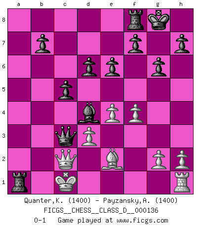 Last move : 0-1 2009 December 7 21:58:31 [Event "FICGS__CHESS__CLASS_D__000136"] [Site "FICGS"] [Date "2009.11.29"] [Round "1"] [White "Quanter,Kirsty"] [Black "Payzansky,Aleksey"] [Result "0-1"] [WhiteElo "1400"] [BlackElo "1400"] 1.e4 c5 2.c4 Nc6 3.Nc3 g6 4.d3 Bg7 5.Qc2 Nf6 6.Bg5 O-O 7.Bxf6 Bxf6 8.O-O-O Qa5 9.a3 Nd4 10.Qa4 Qb6 11.Nge2 Nb3+ 12.Kb1 e6 13.Nc1 Nd4 14.Nb5 a6 15.Ne2 Nxe2 16.Bxe2 d6 17.f4 Bd7 18.Qb3 axb5 19.cxb5 Bd4 20.a4 Ra5 21.Qa2 Bxb5 22.b3 Bxa4 23.Kc1 Bxb3 24.Qb1 Qb4 25.Rd2 Qc3+ 26.Rc2 Bxc2 27.Qxc2 Ra1+ 0-1 Sicilian defense Kingside Castling by player Black (move 6) Queenside Castling by player White (move 8) Player Black won this chess game. Follow this game move after move (download)In Fischer's hands, a slight theoretical advantage is as good a being a Queen ahead. (Isaac Kashdan) Ich kenne keine einzige Person, die behaupten würde, Garri Kasparow sei ein guter Mensch (Nigel Short) Un jugador que es sorprendido, esta derrotado a medias. (Proverbio) Ce qui est bien, c'est d'avoir tout un tas de pièces en prise : l'adversaire ne peut en prendre qu'une à la fois. Cité par Thierry Audin. The mind is like a parachute, it only functions when its open. (Unknown)