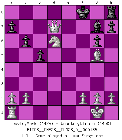 Last move : 1-0 2009 December 15 20:13:0 [Event "FICGS__CHESS__CLASS_D__000136"] [Site "FICGS"] [Date "2009.11.29"] [Round "1"] [White "Davis,Mark"] [Black "Quanter,Kirsty"] [Result "1-0"] [WhiteElo "1425"] [BlackElo "1400"] 1.e4 e5 2.Nf3 Nc6 3.d4 exd4 4.Nxd4 Nxd4 5.Qxd4 c5 6.Qd1 d6 7.Nc3 g6 8.Bb5+ Bd7 9.Bxd7+ Qxd7 10.Bg5 f6 11.Be3 b6 12.O-O f5 13.Qd5 Rd8 14.exf5 Nf6 15.Qf3 Qxf5 16.Qc6+ Rd7 17.Rfe1 Qxc2 18.Bg5 Ne4 19.Rxe4+ Qxe4 20.Nxe4 Bg7 21.Nxd6+ Kf8 22.Qxd7 1-0 Scotch game Kingside Castling by player White (move 12) Player White won this chess game. Follow this game move after move (download)Every Pawn is a potential Queen. (James Mason) Schach wird sich dank seiner hohen kulturellen Tradition immer durchsetzen. In näherer Zukunft womöglich sogar als Gegenreaktion auf die maßlose Reizüberflutung im Freizeit- und Spielbereich. (Garry Kasparov) Muchos se han convertido en Maestros de Ajedrez, nadie se ha convertido en el Maestro del Ajedrez. (Siegbert Tarrasch) Les échecs sont plus proches de l'art de l'assassinat que de l'art de la guerre. (Arturo Perez-Reverte) I live to kill Traxler counterattack. (Ilmars Cirulis)