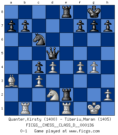 Last move : 0-1 2010 January 7 9:1:3 [Event "FICGS__CHESS__CLASS_D__000136"] [Site "FICGS"] [Date "2009.11.29"] [Round "1"] [White "Quanter,Kirsty"] [Black "Tiberiu,Maran"] [Result "0-1"] [WhiteElo "1400"] [BlackElo "1405"] 1.e4 e5 2.Nf3 Bc5 3.c3 Nf6 4.Nxe5 d6 5.Nd3 Nxe4 6.b4 Bb6 7.f3 Nf6 8.a4 O-O 9.a5 c5 10.axb6 Qxb6 11.bxc5 dxc5 12.Ba3 Re8+ 13.Be2 c4 14.Nf4 Qc6 15.d4 Nd5 16.Nxd5 Qxd5 17.O-O Nc6 18.Re1 Bf5 19.g4 Bd3 20.Nd2 Re6 21.f4 Rae8 22.Qb1 Bxb1 23.Raxb1 Rxe2 0-1 King's knight Opening Kingside Castling by player Black (move 8) Kingside Castling by player White (move 17) Player Black won this chess game. Follow this game move after move (download)The only thing Chess players have in common is Chess. (Lodewijk Prins) Es ist nicht das erste mal, dass sich die FIDE dem Arabischen Geld gebeugt hat (über die FIDE WM 2004 in Lybien). (Larry Evans) Muchos jugadores de Ajedrez se sorprendían cuando después de la partida, Fischer explicaba con calma: 'Yo ya había analizado esta posibilidad' en una posición en la cual yo creía que no era posible de prever desde la apertura. (Mikhail Tal) Je ne suis pas le dernier à jouer lâchement des coups douteux pendant le zeïtnot de l'adversaire pour l'achever: en effet les coups qui font le plus peur sont ceux que l'on ne comprend pas. Je me fais souvent peur quand je joue. (Un professeur anonyme) Every now and then a man's mind is stretched by a new idea and never shrinks back to its former dimensions. (Oliver Wendell Holmes, Sr.)