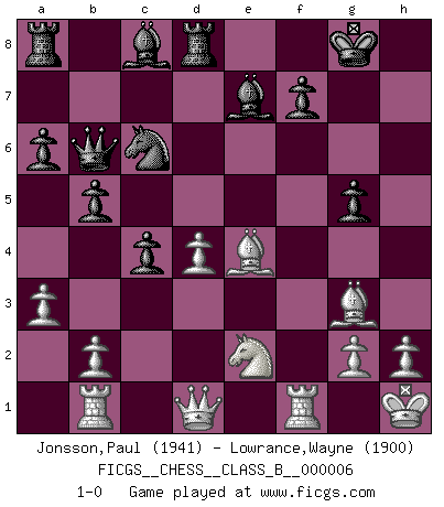 Last move : 1-0 2006 December 26 19:21:16 [Event "FICGS__CHESS__CLASS_B__000006"] [Site "FICGS"] [Date "2006.10.05"] [Round "1"] [White "Jonsson,Paul"] [Black "Lowrance,Wayne"] [Result "1-0"] [WhiteElo "1941"] [BlackElo "1900"] 1.d4 d5 2.c4 e6 3.Nc3 Nf6 4.cxd5 exd5 5.Bg5 Be7 6.e3 O-O 7.Bd3 h6 8.Bh4 c5 9.Nge2 c4 10.Bc2 Nc6 11.a3 Qa5 12.O-O Rd8 13.Rb1 g5 14.Bg3 a6 15.f4 b5 16.fxg5 hxg5 17.e4 Qb6 18.exd5 Nxd5 19.Nxd5 Rxd5 20.Be4 Rd8 21.Kh1 1-0 QGD : Exchange, positional line Kingside Castling by player Black (move 6) Kingside Castling by player White (move 12) Player White won this chess game. Follow this game move after move (download)You know you're going to lose. Even when I was ahead I knew I was going to lose. - On playing against Fischer. (Andrew Soltis) Mein Gehirn das ist mein zweitwichtigstes Organ [Aus dem Film: Der Schläfer]. (Woody Allen) Cada Peón es potencialmente una Reina. (James Mason) Comme les marins qui ont mille raisons différentes d'aller en mer, les joueurs d'échecs en ont tout autant avant de s'installer devant une table et jouer... (Vincent Bertignac, philosophe) A woman without a man is like a fish without a bicycle. (Gloria Steinem)