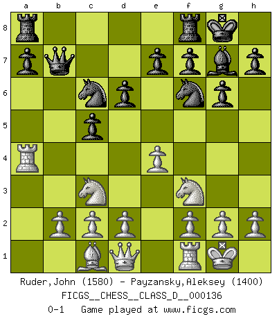 Last move : 0-1 2010 February 24 21:20:0 [Event "FICGS__CHESS__CLASS_D__000136"] [Site "FICGS"] [Date "2009.11.29"] [Round "1"] [White "Ruder,John"] [Black "Payzansky,Aleksey"] [Result "0-1"] [WhiteElo "1580"] [BlackElo "1400"] 1.e4 c5 2.Nf3 d6 3.Bb5+ Bd7 4.Bxd7+ Qxd7 5.O-O Nc6 6.Nc3 g6 7.a4 Bg7 8.a5 Nf6 9.a6 bxa6 10.Rxa6 Qb7 11.Ra4 O-O 0-1 This chess game has been lost on time (started : 2009.11.29 5:14:27) Sicilian : Canal-Sokolsky attack, 3...Bd7 Kingside Castling by player White (move 5) Kingside Castling by player Black (move 11) Player Black won this chess game. Follow this game move after move (download)Later, I began to succeed in decisive games. Perhaps because I realized a very simple truth: not only was I worried, but also my opponent. (Mikhail Tal) Glücklicherweise sind Großmeister Ruben Fines reine Schachbücher weniger phallozentrisch [als seine Schachpsychologie] und deswegen auch weniger lächerlich. (Nigel Short) Coloca el contenido de las piezas del Ajedrez en un sombrero, agitalo vigorosamente, arrojalas en un tablero desde una altura de 30 centimetros y así obtendras el estilo de Steinitz. (H. E. Bird) Fischer est le meilleur joueur du monde et Karpov n'est qu'un joueur de bistrot. (Garry Kasparov, agé de 16 ans) There is a great deal of difference between an eager man who wants to read a book and a tired man who wants a book to read. (G.K. Chesterton)