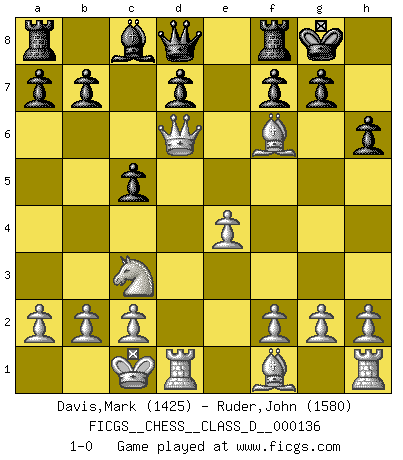 Last move : 1-0 2010 January 10 8:39:37 [Event "FICGS__CHESS__CLASS_D__000136"] [Site "FICGS"] [Date "2009.11.29"] [Round "1"] [White "Davis,Mark"] [Black "Ruder,John"] [Result "1-0"] [WhiteElo "1425"] [BlackElo "1580"] 1.e4 e5 2.Nf3 Nc6 3.d4 exd4 4.Nxd4 Nxd4 5.Qxd4 Nf6 6.Bg5 Bd6 7.Nc3 O-O 8.O-O-O h6 9.Bxf6 c5 10.Qxd6 1-0 This chess game has been lost on time (started : 2009.11.29 5:14:27) Scotch game Kingside Castling by player Black (move 7) Queenside Castling by player White (move 8) Player White won this chess game. Follow this game move after move (download)We must make sure that Chess will not be like a dead language, very interesting, but for a very small group. (Sytze Faber) Sie bekommen vielleicht den Eindruck, dass die Spitzenspieler überhaupt gar nicht so stark sind. Aber das stimmt nicht. Es ist eine Illusion. Mit einem Computer an der Seite ist es sehr leicht, Urteile zu fällen, aber wenn man alleine am Brett sitzt, sieht die Sache ganz anders aus. (Vladimir Kramnik) Bobby Fischer es el jugador de Ajedrez mas grande que jamás haya existido. (Ken Smith) La conception d'un plan est le processus par lequel un joueur exploite les avantages de sa position tout en s'efforçant d'en réduire au minimum les inconvénients. Afin de garantir le succès, un plan doit toujours se fonder sur un diagnostic objectif des particularités d'une position. La conception d'un plan est d'autant plus difficile que la position est équilibrée, et grandement facilitée lorsqu'il n'existe qu'un seul plan susceptible de répondre aux exigences de la position. (Harry Golombek) Mandala - that's it! 16x16 squares as multiple of the four and the eight because of the Four Noble Truths and the Noble Eightfold Path. (Heinz-Georg Lehnhoff about Big Chess)