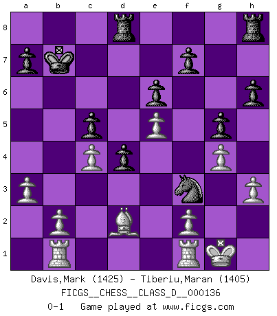 Last move : 0-1 2010 January 13 12:6:41 [Event "FICGS__CHESS__CLASS_D__000136"] [Site "FICGS"] [Date "2009.11.29"] [Round "1"] [White "Davis,Mark"] [Black "Tiberiu,Maran"] [Result "0-1"] [WhiteElo "1425"] [BlackElo "1405"] 1.e4 c5 2.Nf3 Nc6 3.d4 cxd4 4.Nxd4 Nxd4 5.Qxd4 e6 6.Nc3 b6 7.e5 Bc5 8.Qd2 Ne7 9.Bc4 d5 10.Bb5+ Bd7 11.Bxd7+ Qxd7 12.O-O Nf5 13.Qf4 d4 14.Ne4 O-O-O 15.Nxc5 bxc5 16.Bd2 Qb5 17.Rab1 h6 18.g4 g5 19.Qe4 Nh4 20.h3 Kb8 21.a3 Qb7 22.Qxb7+ Kxb7 23.c4 Nf3+ 0-1 Sicilian defense Kingside Castling by player White (move 12) Queenside Castling by player Black (move 14) Player Black won this chess game. Follow this game move after move (download)Chess is a terrible game. If you have no center, your opponent has a freer position. If you do have a center, then you really have something to worry about ! (Siegbert Tarrasch) Modernes Schach erfordert enorme Anspannung. Es ist für einen normalen Menschen unmöglich das auszuhalten. (Viktor Kortschnoi) El Ajedrez es una hermosa aventura. (Bent Larsen) Des points faibles ou des trous dans la position de l'adversaire doivent être occupés par des pièces et non pas par des pions. (Siegbert Tarrasch) Work expands to fill the time available. (C. Northcote Parkinson, in Parkinson's Laws)
