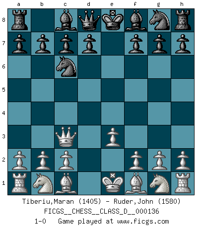 Last move : 1-0 2010 January 10 20:39:46 [Event "FICGS__CHESS__CLASS_D__000136"] [Site "FICGS"] [Date "2009.11.29"] [Round "1"] [White "Tiberiu,Maran"] [Black "Ruder,John"] [Result "1-0"] [WhiteElo "1405"] [BlackElo "1580"] 1.e3 e5 2.d4 exd4 3.Qxd4 Nc6 4.Qc3 1-0 This chess game has been lost on time (started : 2009.11.29 5:14:27) Van't Kruijs Opening Player White won this chess game. Follow this game move after move (download)If Chess is a science, it's a most inexact one. If Chess is an art, it is too exacting to be seen as one. If Chess is a sport, it's too esoteric. If Chess is a game, it's too demanding to be just a game. If Chess is a mistress, she's a demanding one. If Chess is a passion, it's a rewarding one. If Chess is life, it's a sad one. (Unknown) Später, ... hatte ich zunehmend Erfolg in entscheidenden Partien. Vielleicht weil ich eine einfache Wahrheit erkannte: nicht nur ich hatte Angst, auch mein Gegner. (Mikhail Nekhemyevich Tal) Muchos se han convertido en Maestros de Ajedrez, nadie se ha convertido en el Maestro del Ajedrez. (Siegbert Tarrasch) Le pion, dans sa simplicité, marche droit devant lui, mais lorsqu'il prend, il le fait obliquement? Ainsi l'homme, tant qu'il reste pauvre, marche dans la droiture et vit honnêtement, mais lorsqu'il recherche les honneurs, il flatte, se parjure et, par les voies obliques, cherche une position supérieure sur l'échiquier du monde. (Jean de Galles) When I took office, only high energy physicists had ever heard of what is called the World Wide Web... Now even my cat has its own page. (Bill Clinton, 1996)