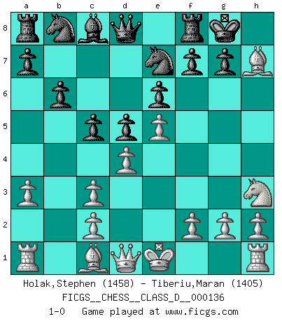 Last move : 1-0 2009 December 17 22:8:23 [Event "FICGS__CHESS__CLASS_D__000136"] [Site "FICGS"] [Date "2009.11.29"] [Round "1"] [White "Holak,Stephen"] [Black "Tiberiu,Maran"] [Result "1-0"] [WhiteElo "1458"] [BlackElo "1405"] 1.d4 e6 2.e4 d5 3.Nc3 Bb4 4.e5 Ne7 5.a3 Bxc3+ 6.bxc3 b6 7.Nh3 O-O 8.Bd3 c5 9.Bxh7+ 1-0 Queen's pawn Kingside Castling by player Black (move 7) Player White won this chess game. Follow this game move after move (download)Nowadays, when you're not a grandmaster at 14, you can forget about it. (Anand Viswanathan) Ich erzeugte keinen Neid, da mich die Schachspieler als Musiker und die Musiker als Schachspieler betrachteten. (Mark Taimanov) Nunca antes ha habido un jugador de Ajedrez con tal conocimiento a fondo de las complejidades del juego y una inmensa voluntad absolutamente indomable de ganar. Yo pienso que Fischer es el jugador mas grande que jamás haya existido. (Lisa Lane) Les Echecs ont trois composantes : le temps, l'espace et le matériel en dernier. (Mikhail Tal) Luck is when opportunity knocks and you answer. (Anonymous)