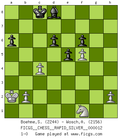 Last move : 1-0 2010 April 2 22:25:51 [Event "FICGS__CHESS__RAPID_SILVER__000012"] [Site "FICGS"] [Date "2009.11.29"] [Round "2"] [White "Boehme,Sebastian"] [Black "Wosch,Arkadiusz"] [Result "1-0"] [WhiteElo "2244"] [BlackElo "2156"] 1.e4 c5 2.Nf3 Nc6 3.d4 cxd4 4.Nxd4 Nf6 5.Nc3 d6 6.Bg5 e6 7.Qd2 a6 8.O-O-O Bd7 9.f4 b5 10.Bxf6 gxf6 11.Kb1 Qb6 12.Nxc6 Bxc6 13.Qe1 O-O-O 14.Qh4 Be7 15.Bd3 b4 16.Ne2 h5 17.f5 e5 18.Bc4 Rdg8 19.Ng3 Kb8 20.Bxf7 Rg4 21.Qh3 Rf4 22.Bd5 Rc8 23.Qxh5 Rf2 24.Rc1 Bb5 25.Rhd1 Qc5 26.Bb3 Rxg2 27.Nf1 Rf2 28.Qh7 Bf8 29.Qg6 Bc6 30.Re1 Be7 31.Qf7 Bd8 32.Be6 b3 33.axb3 Rxc2 34.Rxc2 Bxe4 35.Rxe4 Qxc2+ 36.Ka2 Qxe4 37.Bxc8 Kxc8 38.Qc4+ Qxc4 39.bxc4 1-0 Sicilian defense Queenside Castling by player White (move 8) Queenside Castling by player Black (move 13) Player White won this chess game. Follow this game move after move (download)Place the contents of the Chess box in a hat, shake them up vigorously, pour them on the board from a height of two feet, and you get the style of Steinitz. (H. E. Bird) Das typische an einem Großmeister ist, daß er eine gewonnene Position schnell und schmerzlos gewinnt. (Irving Chernev) Alekhine es un poeta que crea un trabajo de arte de algo que raramente inspiraría a otra persona a mandar una tarjeta postal. (Max Euwe) On entre au jeu d'Echecs comme on entre en Religion. Pour le joueur d'Echecs, la partie d'Echecs c'est l'office, la messe, le défilé du 1er Mai, le dépôt de gerbe au Monument aux Morts. C'est un drame sacré. (Michel Roos) The bottom line is always the bottom line. (Johann Piek)