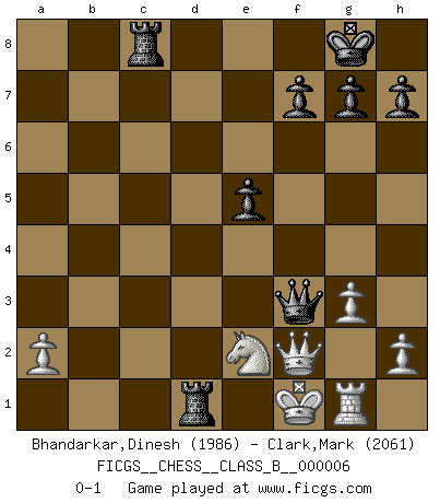 Last move : 0-1 2006 October 30 3:40:35 [Event "FICGS__CHESS__CLASS_B__000006"] [Site "FICGS"] [Date "2006.10.05"] [Round "1"] [White "Bhandarkar,Dinesh"] [Black "Clark,Mark"] [Result "0-1"] [WhiteElo "1986"] [BlackElo "2061"] 1.e4 d5 2.exd5 Nf6 3.Bb5+ Bd7 4.Bxd7+ Qxd7 5.c4 c6 6.dxc6 Nxc6 7.Ne2 e5 8.Nbc3 Bc5 9.d3 Rd8 10.Bg5 Qxd3 11.Qa4 Bxf2+ 12.Kxf2 Qf5+ 13.Ke1 Qxg5 14.g3 O-O 15.Rd1 Qe3 16.Nd5 Nxd5 17.cxd5 Nd4 18.Qc4 Nf3+ 19.Kf1 Nd2+ 20.Rxd2 Qxd2 21.Nc3 Qxb2 22.Qb3 Qd2 23.Rg1 Rc8 24.Ne2 Rfd8 25.Qxb7 Qxd5 26.Qxa7 Qf3+ 27.Qf2 Rd1+ 0-1 Scandinavian defense Kingside Castling by player Black (move 14) Player Black won this chess game. Follow this game move after move (download)Blessed be the memory of him who gave the world this immortal game. (A. G. Gardiner) Offensichtlich kennt Kasparow nichts anderes als Schach, und ich könnte 500 weitere Spieler dieser Sorte benennen. (Judith Polgar) Un Peón pasado es un criminal, quién debe ser mantenido bajo candado y llave. Leves medidas, tales como vigilancia policiaca, no son suficientes. (Aaron Nimzovich) Fischer est le meilleur joueur du monde et Karpov n'est qu'un joueur de bistrot. (Garry Kasparov, agé de 16 ans) The Internet isn't free. It just has an economy that makes no sense to capitalism. (Brad Shapcott)