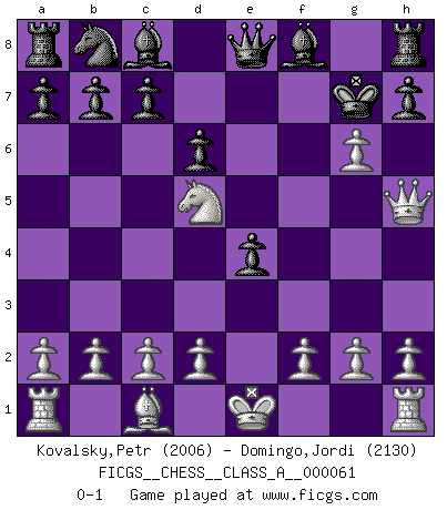 Last move : 0-1 2010 January 7 19:26:59 [Event "FICGS__CHESS__CLASS_A__000061"] [Site "FICGS"] [Date "2009.12.01"] [Round "1"] [White "Kovalsky,Petr"] [Black "Domingo,Jordi"] [Result "0-1"] [WhiteElo "2006"] [BlackElo "2130"] 1.e4 e5 2.Nf3 f5 3.exf5 e4 4.Ne5 Nf6 5.Be2 d6 6.Bh5+ Ke7 7.Nf7 Qe8 8.Nc3 Nxh5 9.Nd5+ Kxf7 10.Qxh5+ g6 11.fxg6+ Kg7 0-1 Latvian counter-gambit Player Black won this chess game. Follow this game move after move (download)The essence of Chess is thinking about what Chess is. (David Bronstein) Herr Iljumschinow ist ein etwas merkwürdiger Geschäftsmann: Er arbeitet zusammen mit Leuten wie Muammar al-Gaddafi; früher ist das Saddam Hussein gewesen. (Joel Lautier) El Ajedrez por encima de todo... ¡es una pelea!. (Emanuel Lasker) Roi des jeux et jeu des rois, les échecs portent en eux un sentiment d'infini. Ils donnent à celui qui s'est efforcé d'en approfondir les arcanes l'impression de n'être pas à la mesure de l'homme; en fait, ils constituent un résumé de l'univers, un microcosme, et figurent cette grande échelle qui, dans les plans de la lumière descend jusqu'à la matière, qui des abîmes insondables remonte jusqu'en l'infini de Dieu. (Pyrame) There are two kinds of people in the world, my friend. Those who have a loaded gun and those who dig. You dig ! (Blondie in The Good, The Bad and The Ugly)