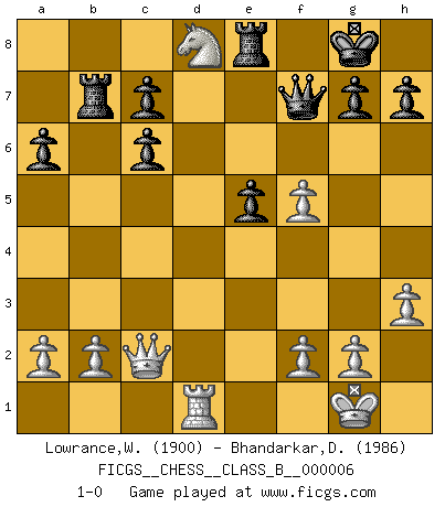 Last move : 1-0 2006 November 8 4:31:11 [Event "FICGS__CHESS__CLASS_B__000006"] [Site "FICGS"] [Date "2006.10.05"] [Round "1"] [White "Lowrance,Wayne"] [Black "Bhandarkar,Dinesh"] [Result "1-0"] [WhiteElo "1900"] [BlackElo "1986"] 1.e4 e5 2.Nf3 Nc6 3.Bb5 a6 4.Bxc6 dxc6 5.O-O f6 6.d4 Bg4 7.c3 Bd6 8.Nbd2 Nh6 9.h3 Be6 10.Nb3 Nf7 11.Qc2 Qe7 12.Be3 b6 13.c4 exd4 14.Nbxd4 Bd7 15.Nf5 Bxf5 16.exf5 O-O 17.Rfe1 Qd7 18.c5 bxc5 19.Bxc5 Rfe8 20.Nd4 Ne5 21.Rad1 Rab8 22.Ne6 Qe7 23.Ba7 Rb7 24.Bd4 Qf7 25.Bxe5 Bxe5 26.Rxe5 fxe5 27.Nd8 1-0 Ruy Lopez : Exchange, Gligoric variation Kingside Castling by player White (move 5) Kingside Castling by player Black (move 16) Player White won this chess game. Follow this game move after move (download)Fischer Chess play was always razor-sharp, rational and brilliant. One of the best ever. (Dave Regis) Mit Schach schule ich mein Gefühl für Geometrie, was für Tennis und Schach gleichermaßen wichtig ist. (Boris Becker) Vive, pierde y aprende al observar a tu oponente como ganar. (Amber Steenbock) Tous ces prétendus hommes politiques sont les pions, les Cavaliers, les Tours ou les Fous d'une partie d'échecs qui se jouera tant qu'un hasard ne renversera pas l'échiquier. (Honoré de Balzac) It is not titles that honor men, but men that honor titles. (Niccolo Machiavelli)